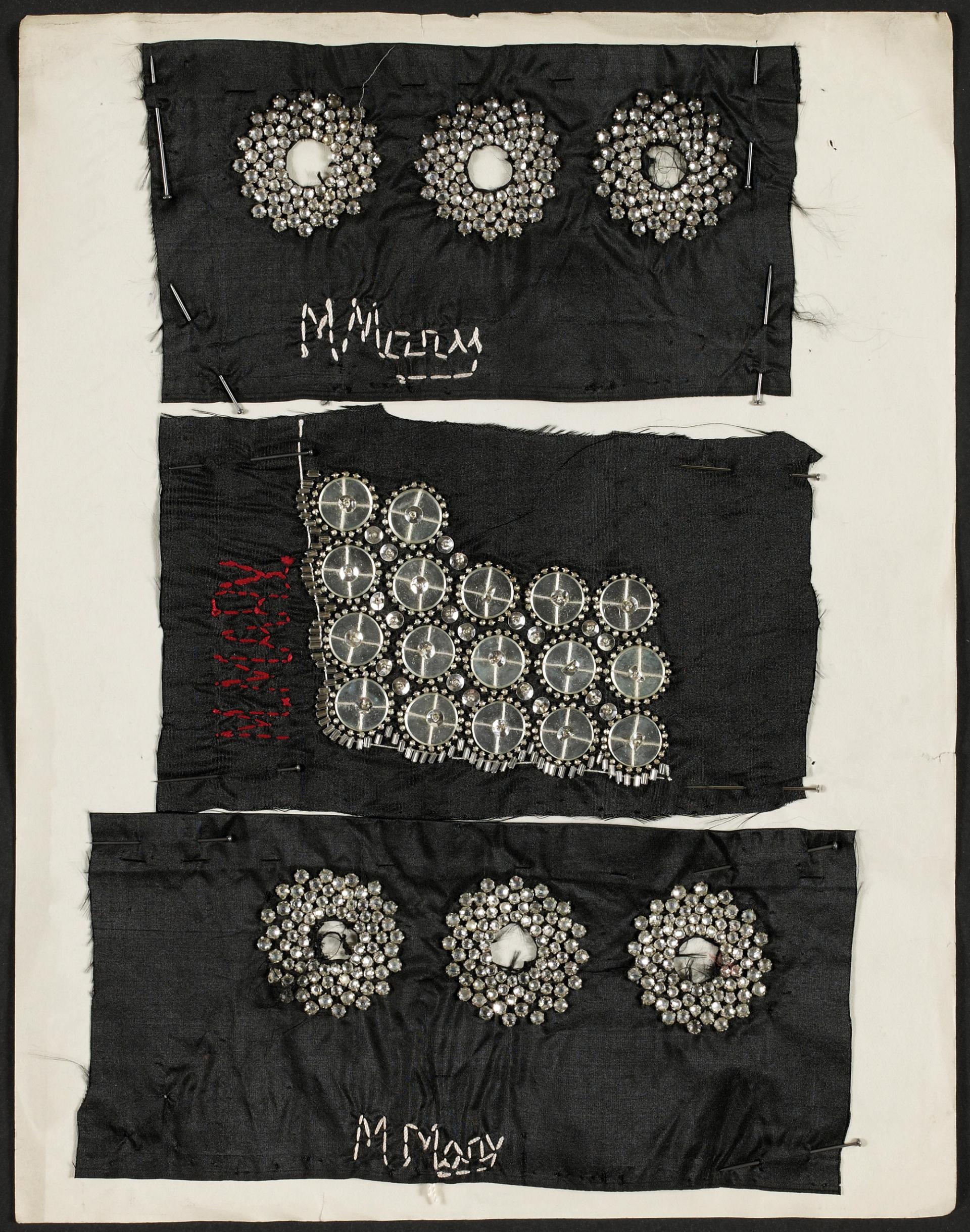 PC I’ve been told she wanted to set up a museum, and that would explain why the archive is so in-depth. It’s housed just outside of Paris and contains thousands of pieces. I like the embroidery samples most of all, swatches upon swatches. A lot of them tend to be geometric designs and they’re pinned on paper that has been recycled—old client orders. So you have information about a client’s acquisition, and often some personal comments like: “She’s gained a bit of weight.” It’s a gorgeous insight. Some of the designs I’ve used directly, like this one of large mirror sequins on a silver embroidered panel.