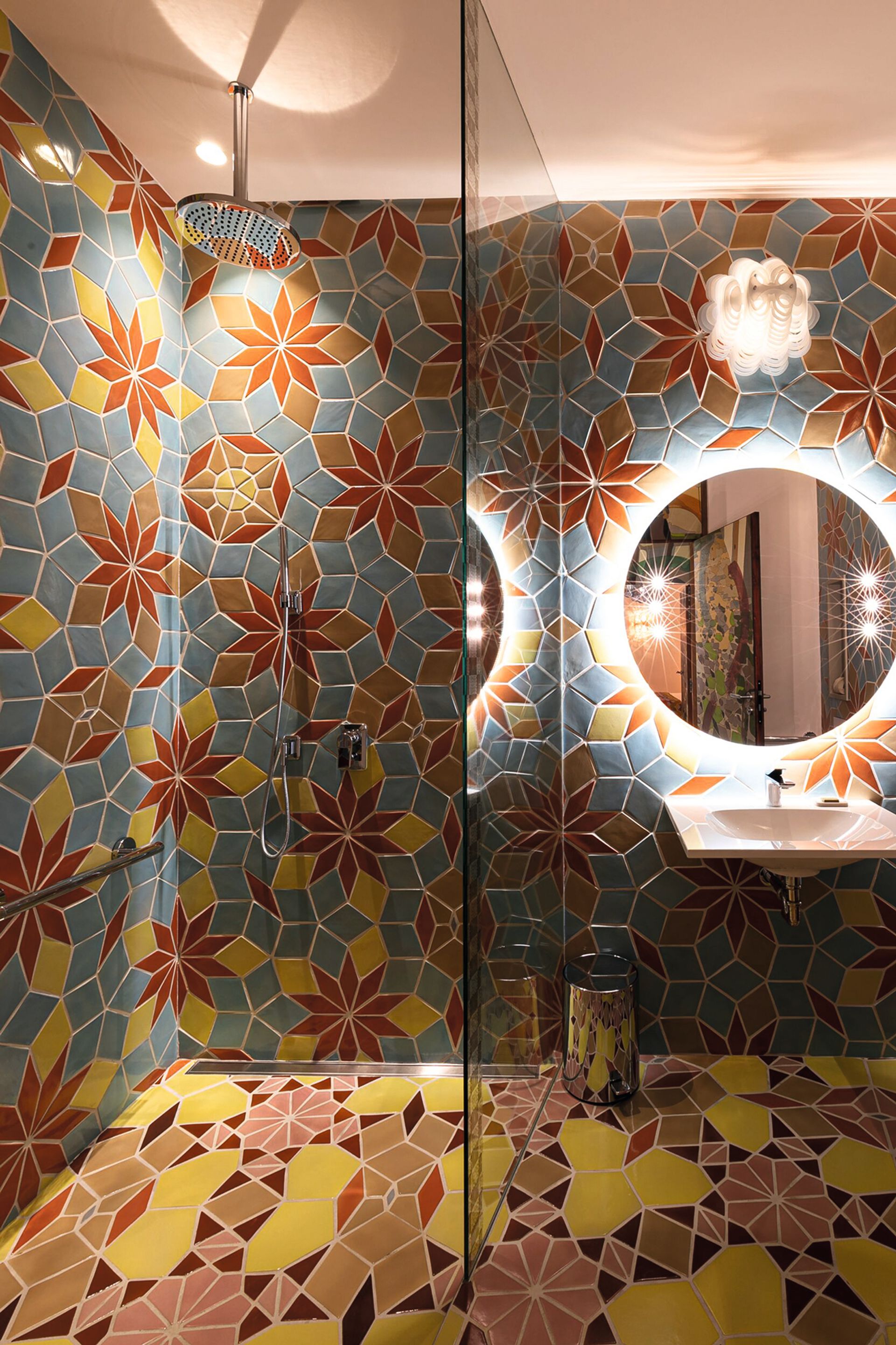 When Maja Hoffmann, the visionary behind the Luma Foundation in Arles, acquired a 15th-century hôtel particulier in the city and decided to turn it into an actual hotel, her first call was to the Cuban-born American artist Jorge Pardo. Hoffmann offered him carte blanche to reinvent its interior as a Gesamtkunstwerk, and Pardo duly designed every detail, from the key cards to the furniture to the 400 light fittings, turning it into the brilliantly coloured L’Arlatan. But the pièces de resistance are the ceramic tiles: 11 different geometric shapes in 18 colours that tessellate into a pattern that never repeats itself over almost 6,000 sq. m, covering the entire floor of all three storeys, as well as the bathrooms and the walls of the swimming pool.