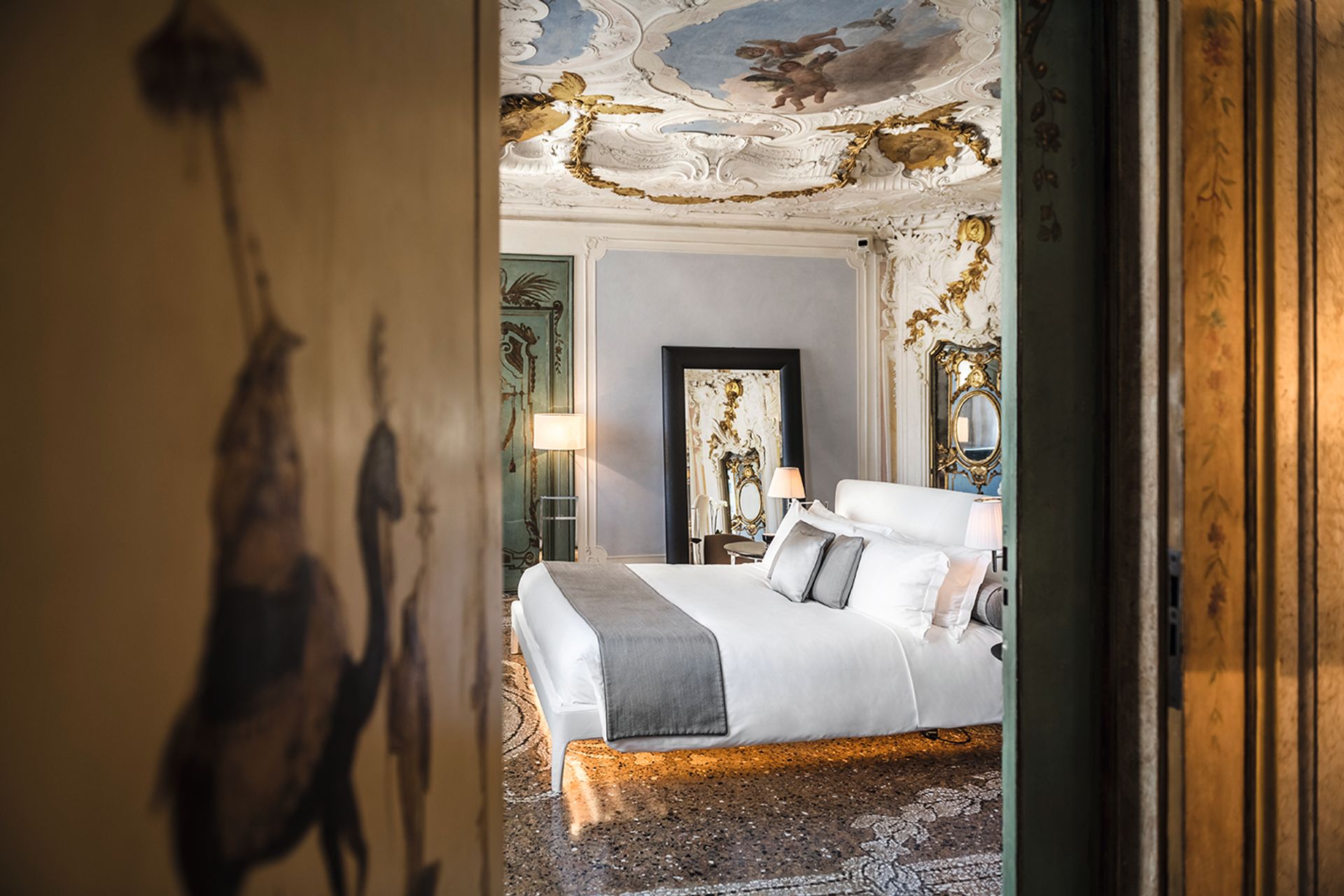 Built around 1570, what is now the Palazzo Papadopoli—better known as Aman Venice—used to be called the Palazzo Tiepolo. It was acquired by a relative of the great Venetian Rococo painter Giovanni Battista Tiepolo in 1748, who invited the artist to paint the ceiling of the alcove in what is now its 103 sq. m Alcova Tiepolo Suite (its Chinoiserie murals remain unattributed). The rest of the decor is a fairly sober scheme by Christian Liaigre, though two carnival scenes in its games room—also beautifully restored—are the work of Giovanni Battista’s son, Giovanni Domenico.