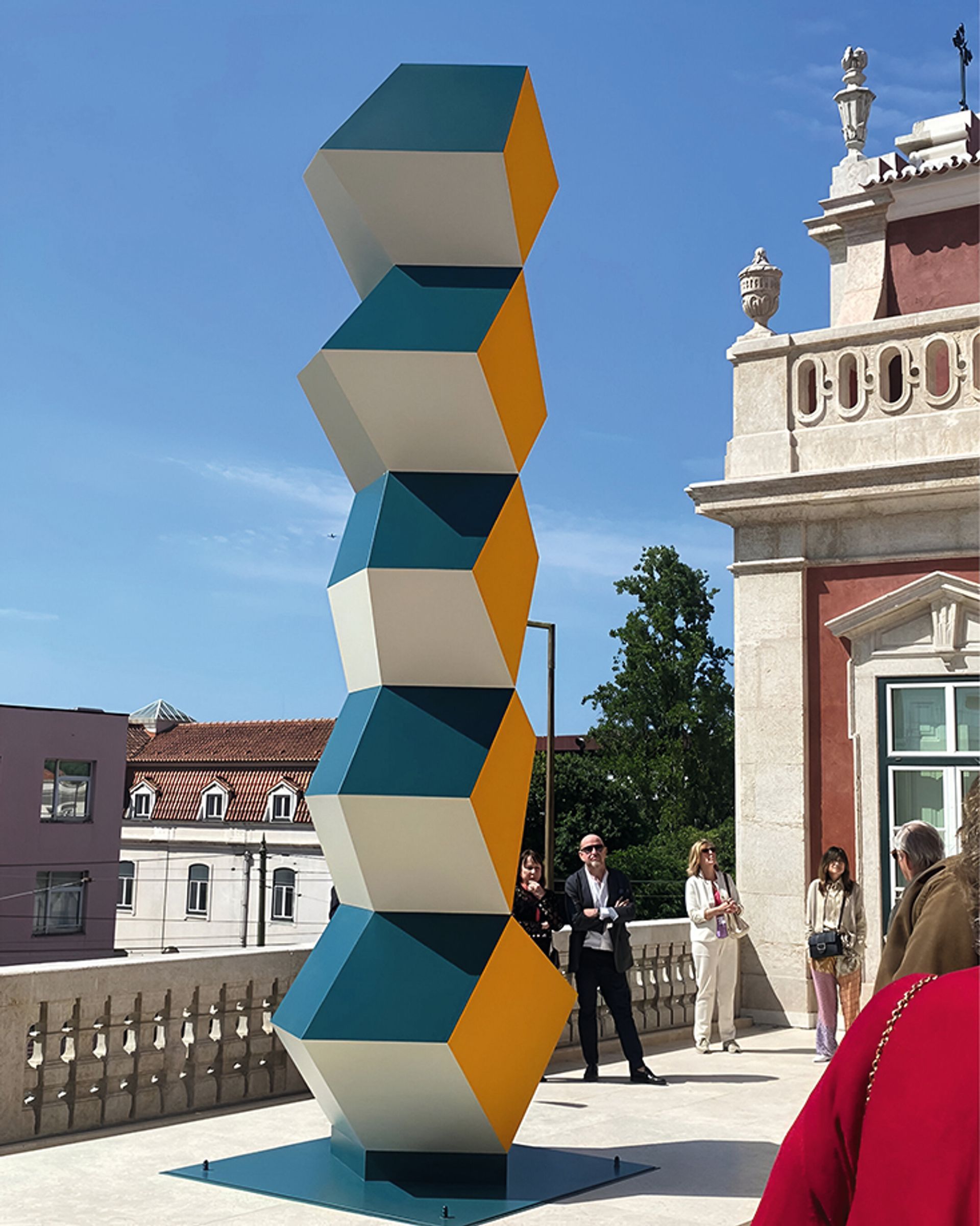 Also new this year is the MACAM Hotel in Lisbon, which shares the 18th-century Palácio Condes da Ribeira Grande with the Museu de Arte Contempoânea Armando Martins. The museum displays works from a collection of more than 600 works amassed by the Portuguese real estate and hospitality tycoon and is one of the best private contemporary art collections in Portugal. It includes works by renowned international names—Marina Abramović, John Baldessari, Olafur Eliasson, Vik Muniz, Ernesto Neto, Albert Oehlen—alongside Martins’s exceptional collection of less-well-known Portuguese Modernists, particularly the work of Eduardo Viana. There are site-specific works by Carlos Aires and José Pedro Croft and, on the western terrace, Canadian sculptor Angela Bulloch’s Heavy Metal Stack of Five, Yellow 80 (2024), a four-metre-high tower of five irregular geometric shapes, each facet painted blue, yellow or white to create an optical illusion.