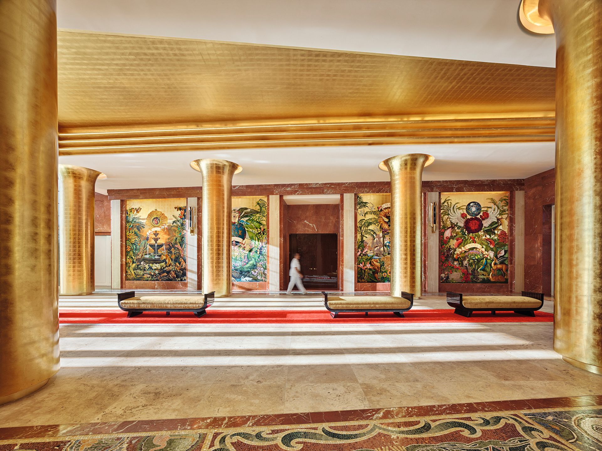 Just about visible from the beach, Damien Hirst’s Gone but Not Forgotten (2014), a 24-carat-gold-plated 10,000-year-old mammoth skeleton housed in a glass vitrine, may be the most Instagrammed image of the Miami Modern palace formerly known as The Saxony, and since 2015 as the Faena Miami Beach. A collaboration between the collector-philanthropists Alan Faena and Len Blavatnik, the whole hotel is filled with art and its rooms were designed by the film director Baz Luhrmann. But it may well be that the monumental gold-flecked murals and mosaic floors in its lobby by the Argentine artist Juan Gatti will be the feature that outlives everything else.