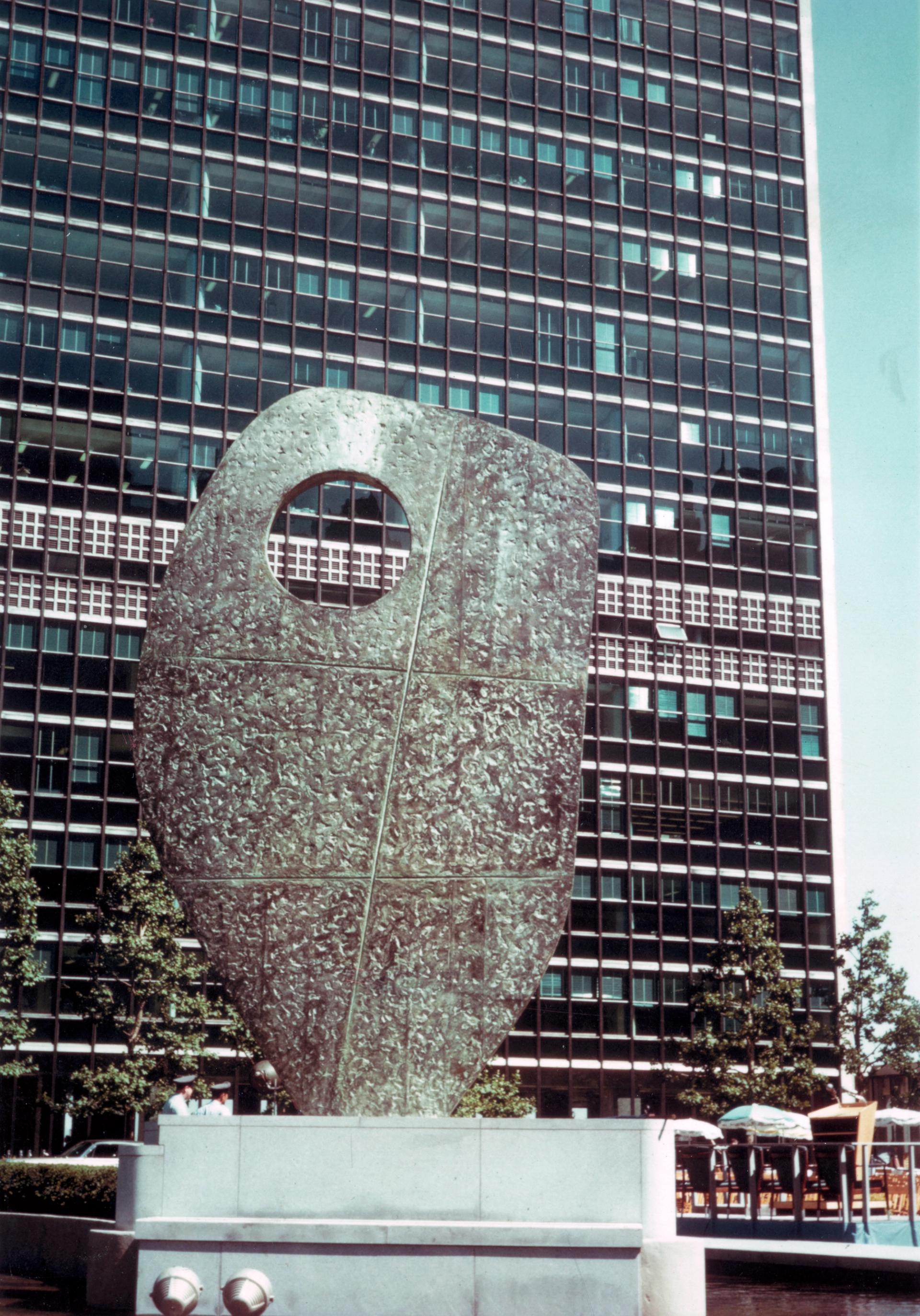 Hepworth remained politically engaged after the war. In 1961, she co-authored a statement opposing nuclear weapons, writing: “Culture means the affirmation of life…they are the negation of life.” Dag Hammarskjöld, the secretary general of the United Nations (UN), had become a friend, and they met in London when he gave an address on the UN’s diplomatic role in achieving global nuclear disarmament. In September 1961 Hammarskjöld was killed in a plane crash, and Hepworth was commissioned to make a monumental sculpture for the UN headquarters in New York in his memory. At its unveiling, Hepworth said: “The United Nations is our conscience. If it succeeds it is our success. If it fails it is our failure…I have tried to perfect a symbol...of both continuity and solidarity for the future.”