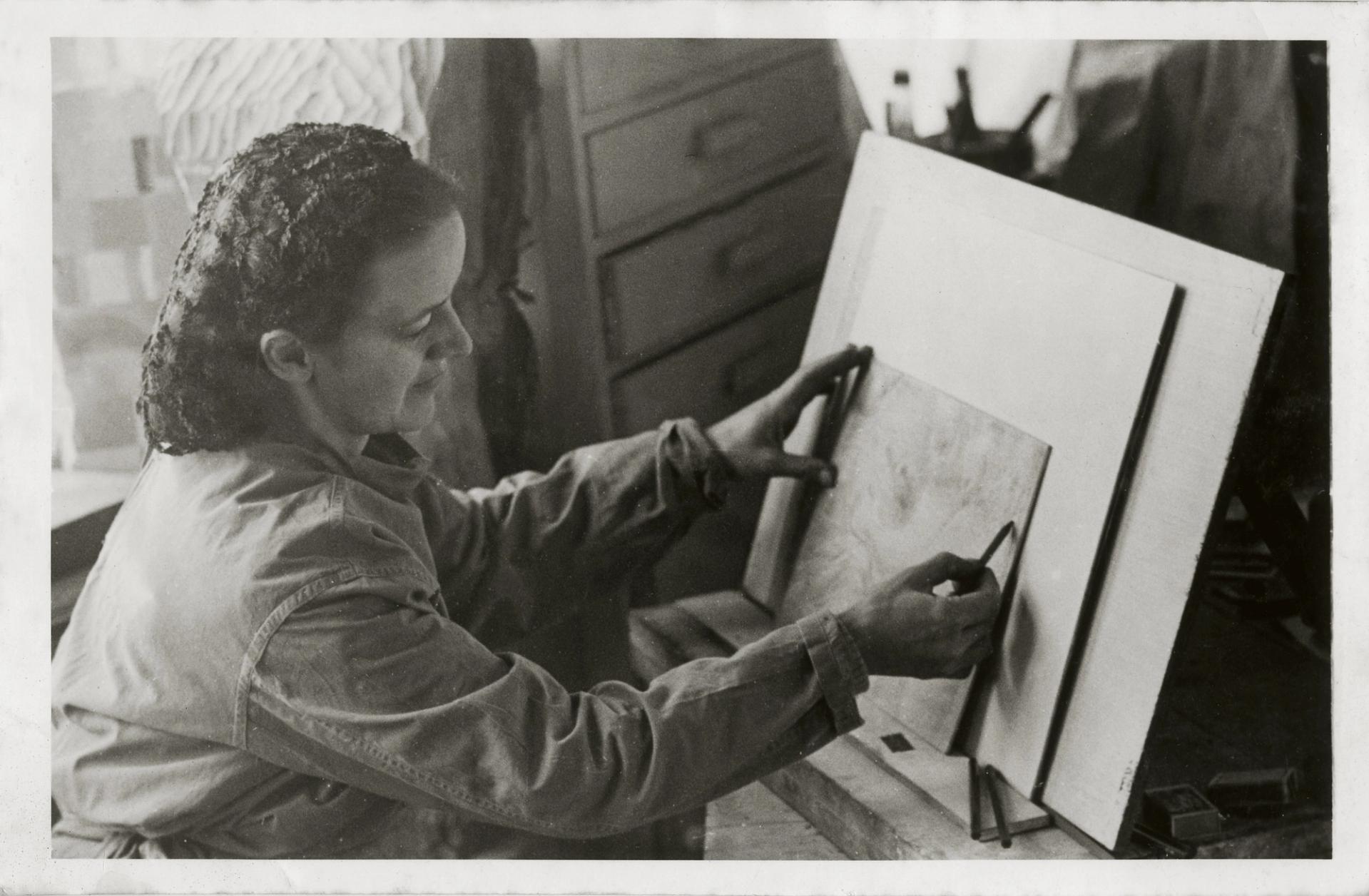 Barbara Hepworth at work on Quartet I (Arthroplasty), another operating theatre drawing, Cornwall, 1948