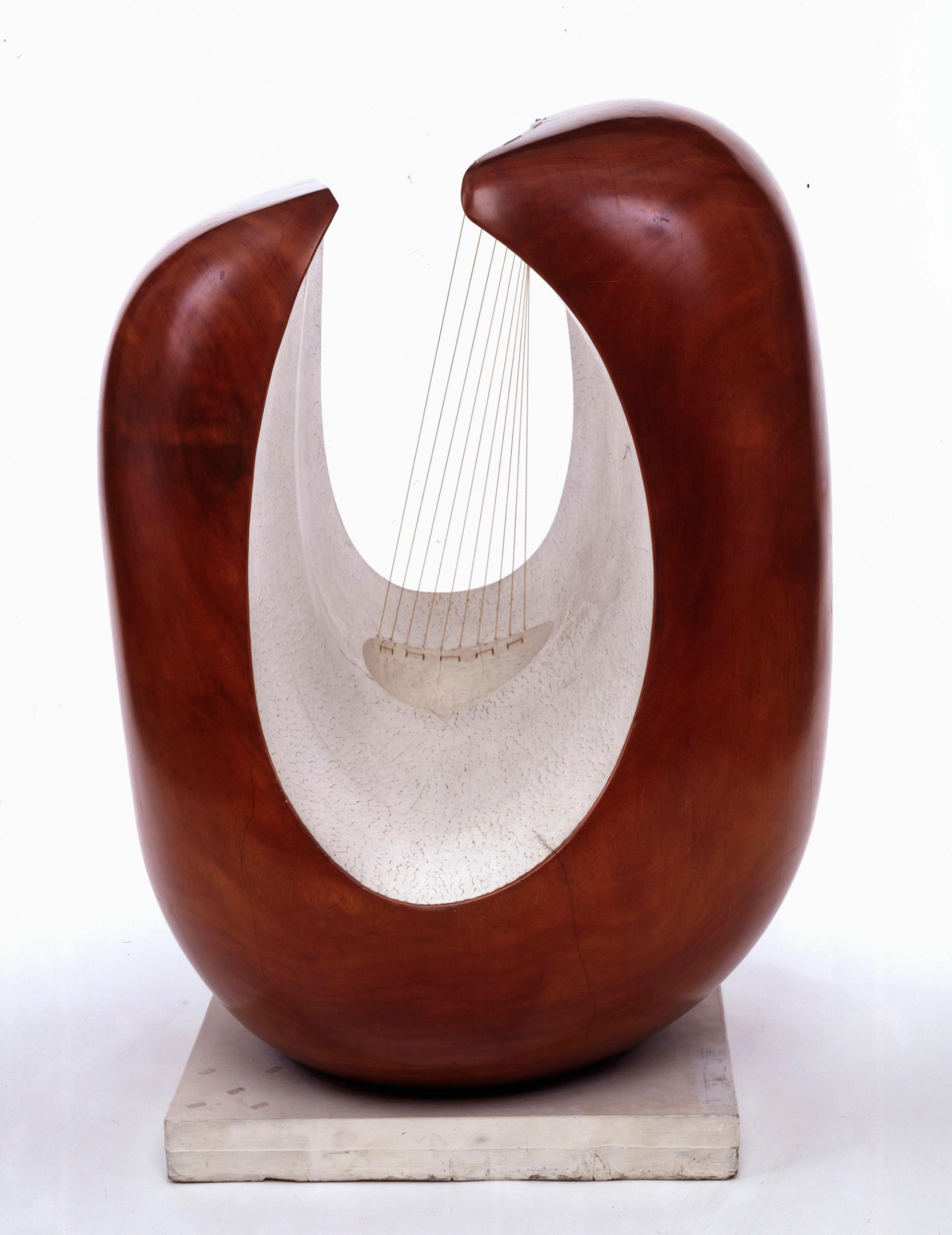 In 1953 Hepworth’s son Paul died in an aircraft accident. The following year, a friend took her to Greece in an attempt lift her grief. The landscape deeply moved Hepworth, and of Delphi she wrote: “On a fair and glorious morning I managed to escape some 400 people and ascend the hill alone and in silence […] standing alone in the stadium, alone below Olympus, I felt at ease both physically and spiritually”. On her return, Curved Form (Delphi) became one of the first of several sculptures carved from huge logs of Guarea wood. The strings continue to express Hepworth’s relationship with landscape, while also evoking the lyre of Apollo, god of healing, truth and light, whose temple is at Delphi.