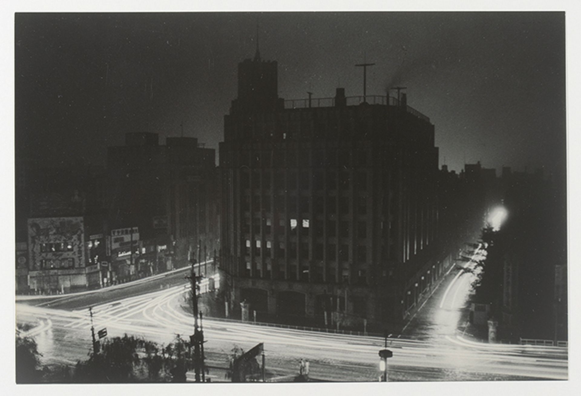 In this undated photograph from the 1950s, Gen Otsuka captures a large office building on Tokyo’s Sukiyabashi crossing from a rooftop across the street. In contrast to the darkened windows, the car lights become bright streaks in the camera’s long exposure. It could be that this blackout image was intended as a reminiscence of wartime bombardments, yet in two photographs of the same building from a similar vantage point, one with the windows brilliantly lit, Otsuka explores the full range of his fascination with blurring the boundaries between day and night. Rather than using the cinematic ‘day for night’ technique of simulating night scenes in daylight, his photography mixes the two into a third state.