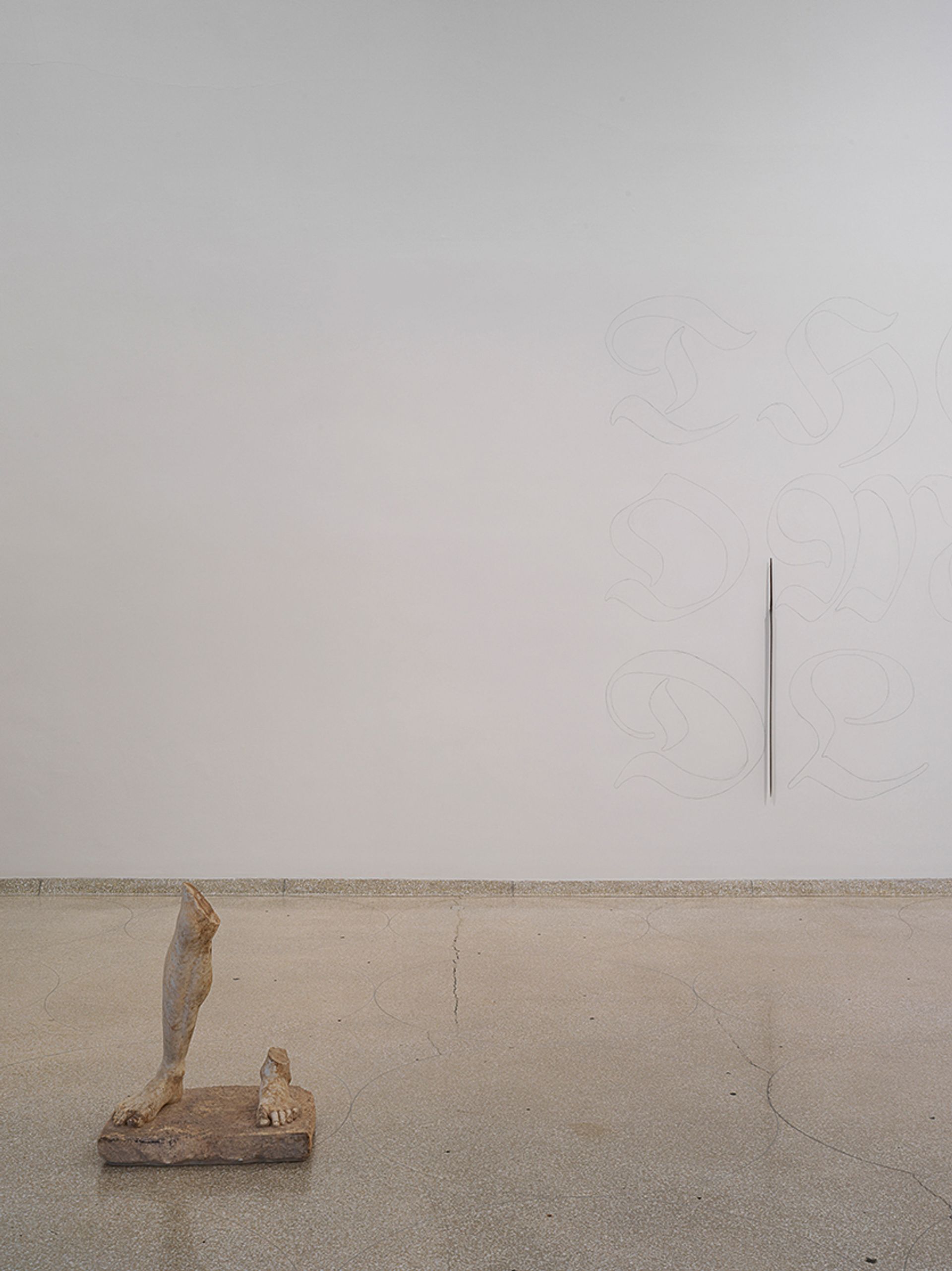 Vietnamese artist Danh Võ’s work Take My Breath Away resuscitates a second-century Roman sculpture that was once a male statue—a god, a statesman, or perhaps a poet—and is now reduced to just two feet standing slightly apart on a pedestal, one of which extends to an ankle and the other to a calf, broken just above the knee. This ancient fragment has a metal brace around its marble ankle; as in Japanese kintsugi ceramic techniques, the damage is incorporated into the repair, not disguised. Võ’s work wears absence proudly, and he makes it even more palpable by borrowing the title from the Los Angeles synth-pop band Berlin’s biggest (and last) hit, released in 1986. Forever associated with the jingoistic Hollywood blockbuster of the same year, Top Gun, Take My Breath Away is about innuendos, “thoughts unsaid, then forgotten”, to borrow a phrase from a work by Bas Jan Ader.
