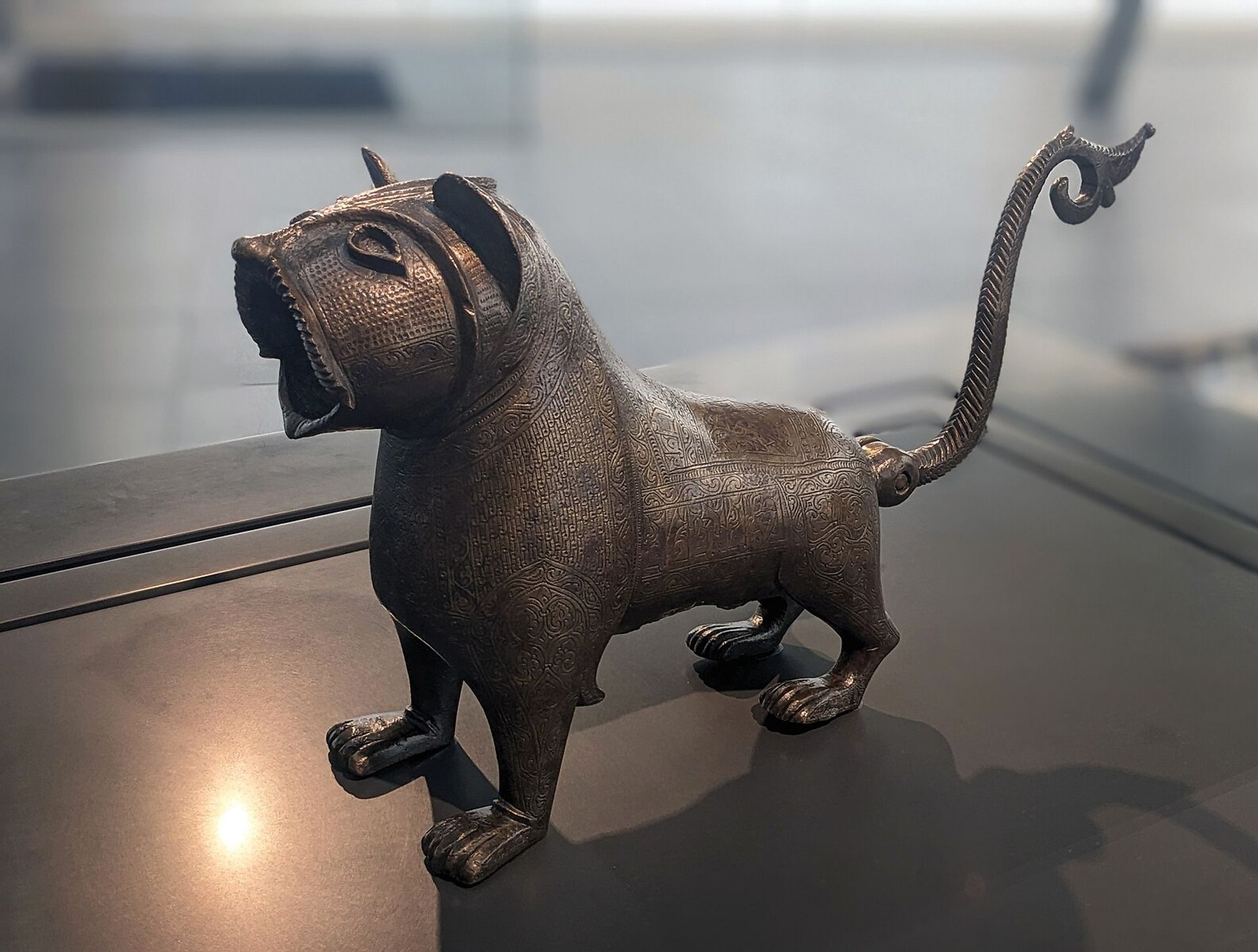 The glass-covered Cour Visconti, opened in 2012, is home to the Louvre's Islamic art collection, the most recently configured of the museum's major departments. This elaborate bronze lion from Spain's medieval Al-Andalus has elaborate engraving in Kufic script, one of the oldest forms of Arabic calligraphy. Scholars don't quite agree on its original function, but the wide mouth might seem to indicate that it was used as a water spout. Some believe its tail could be moved to mark the passage of time. Both rare and ornate, the Louvre promoted it as the Cour Visconti's signature object when it launched the new space.