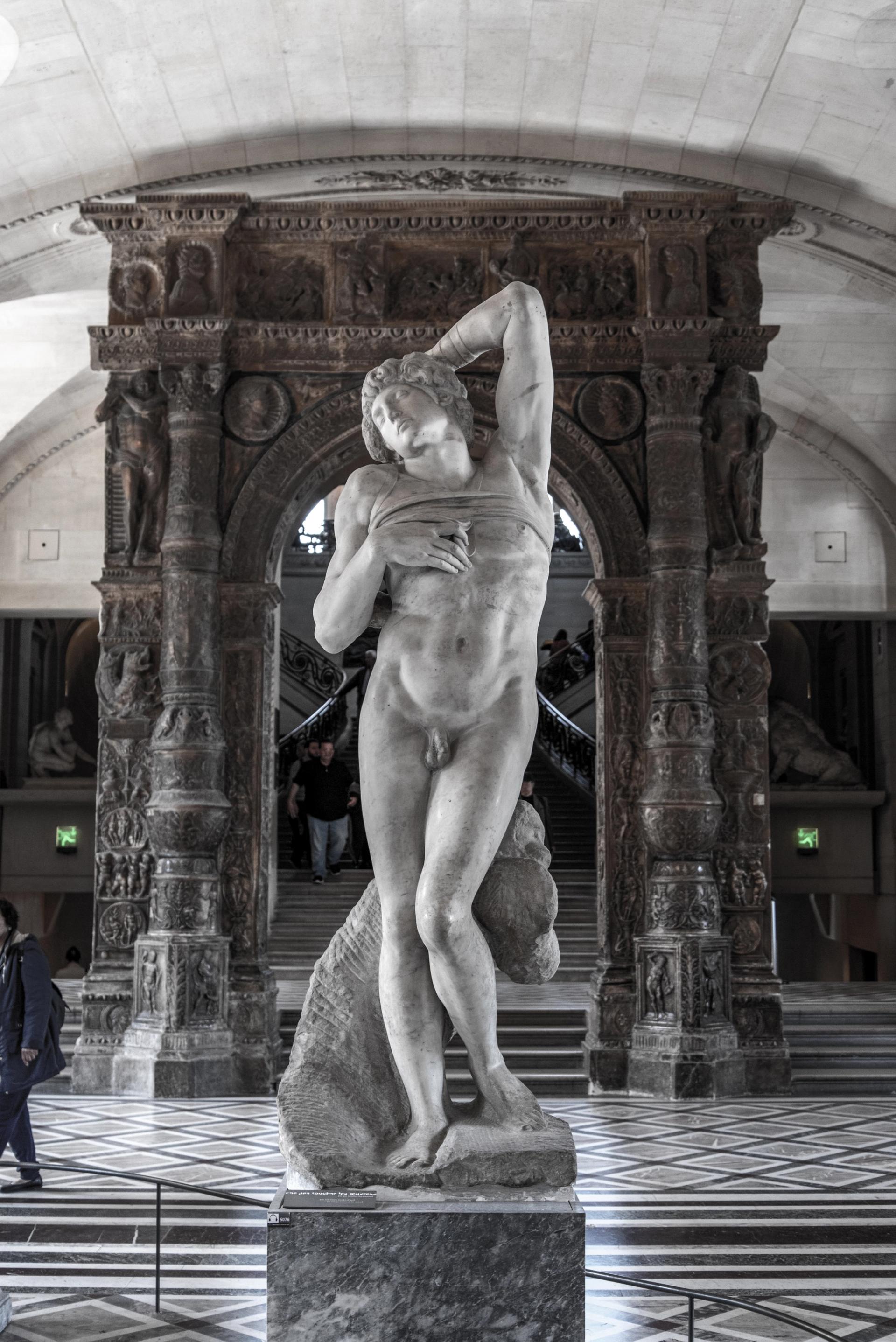 Originally commissioned in 1505 for the tomb of Pope Julius II and completed just after his death, this seven-foot masterpiece reached France by the middle of the 16th century. After bouncing around a number of noblemen's chateaux, it finally reached the Louvre in 1794. Recalling the dynamic suffering of Hellenistic sculpture, it can also seem to anticipate the later Baroque innovation of pairing ecstasy with death. And it has few rivals in its depiction of male beauty—save, perhaps, the artist's own David, created a decade earlier.