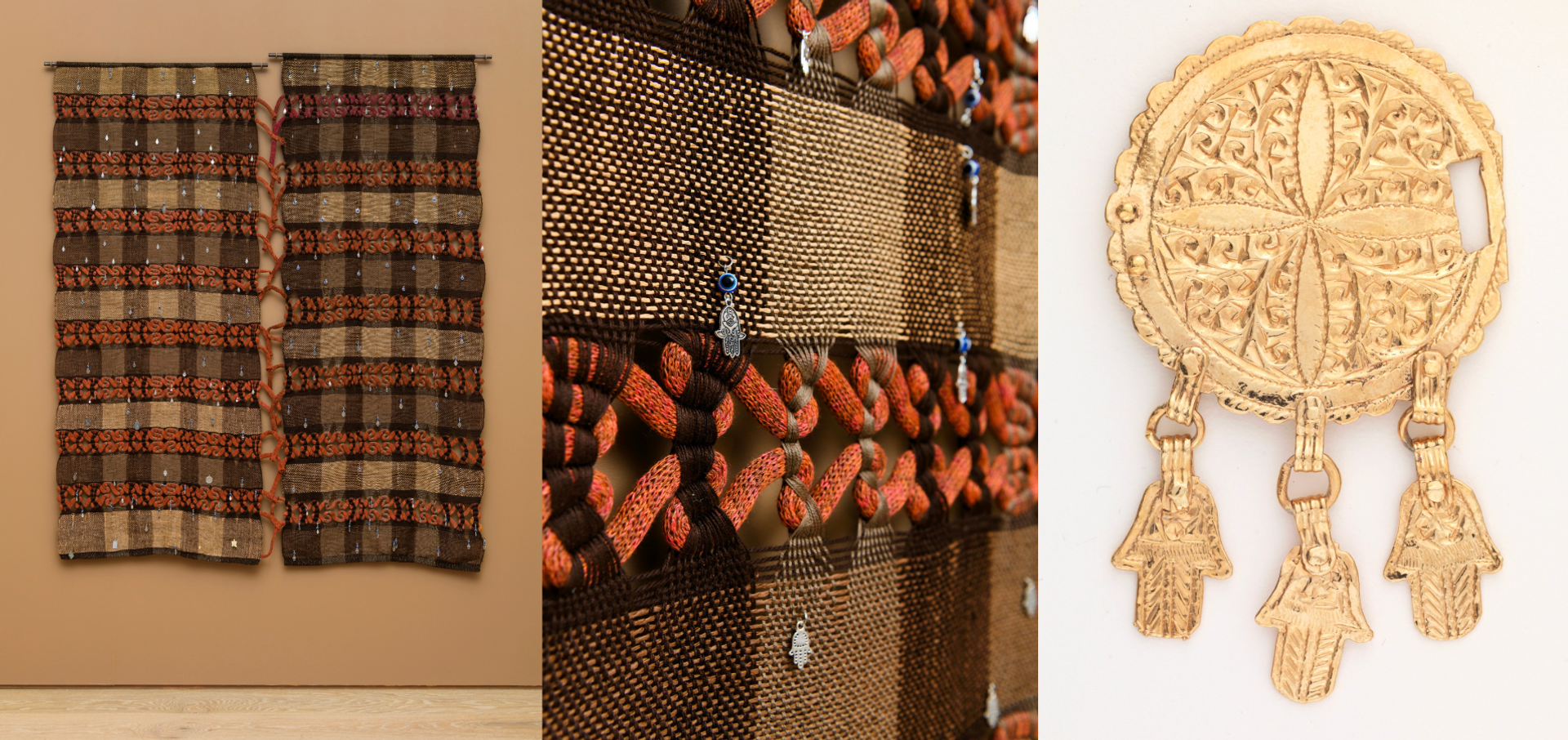 Left and centre: Damien Ajavon's Chemin vers Oslo (2025); right: an embossed gold belt buckle with hands of Fatima by an unknown artist (1800s–1900s), from the collection of the Shangri La Museum of Islamic Art, Culture & Design Hawaii Ajavon: © Damien Ajavon / BONO. Photo by Annar Bjørgli / The National Museum; belt buckle: photo by Shangri La Museum of Islamic Art, Culture & Design