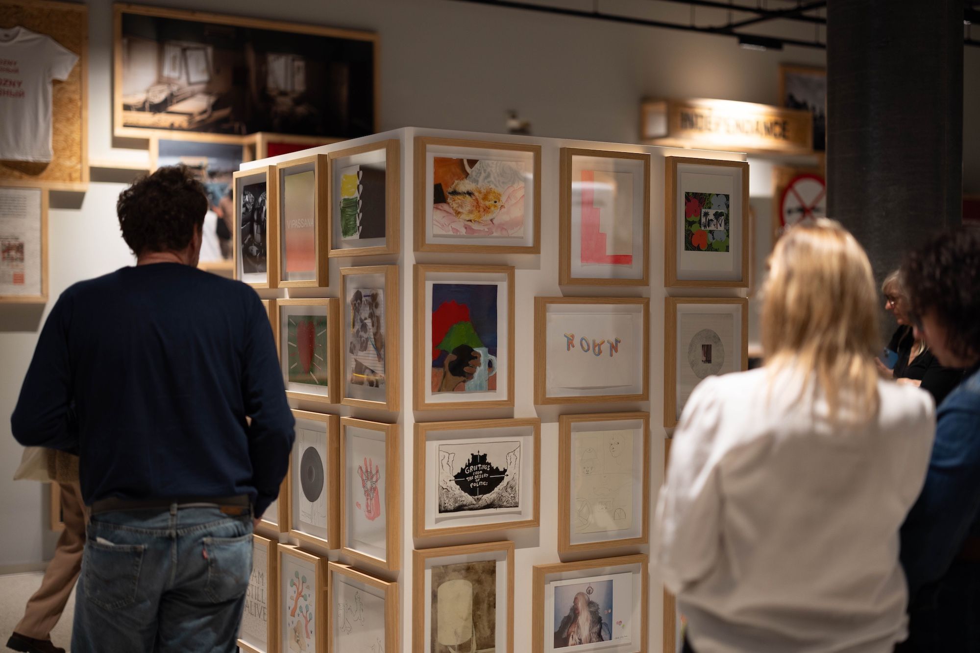 Installation view of the 100 Artists for Gaza exhibition at Médecins Sans Frontières headquarters in Geneva Photo by Médecins Sans Frontières Geneva