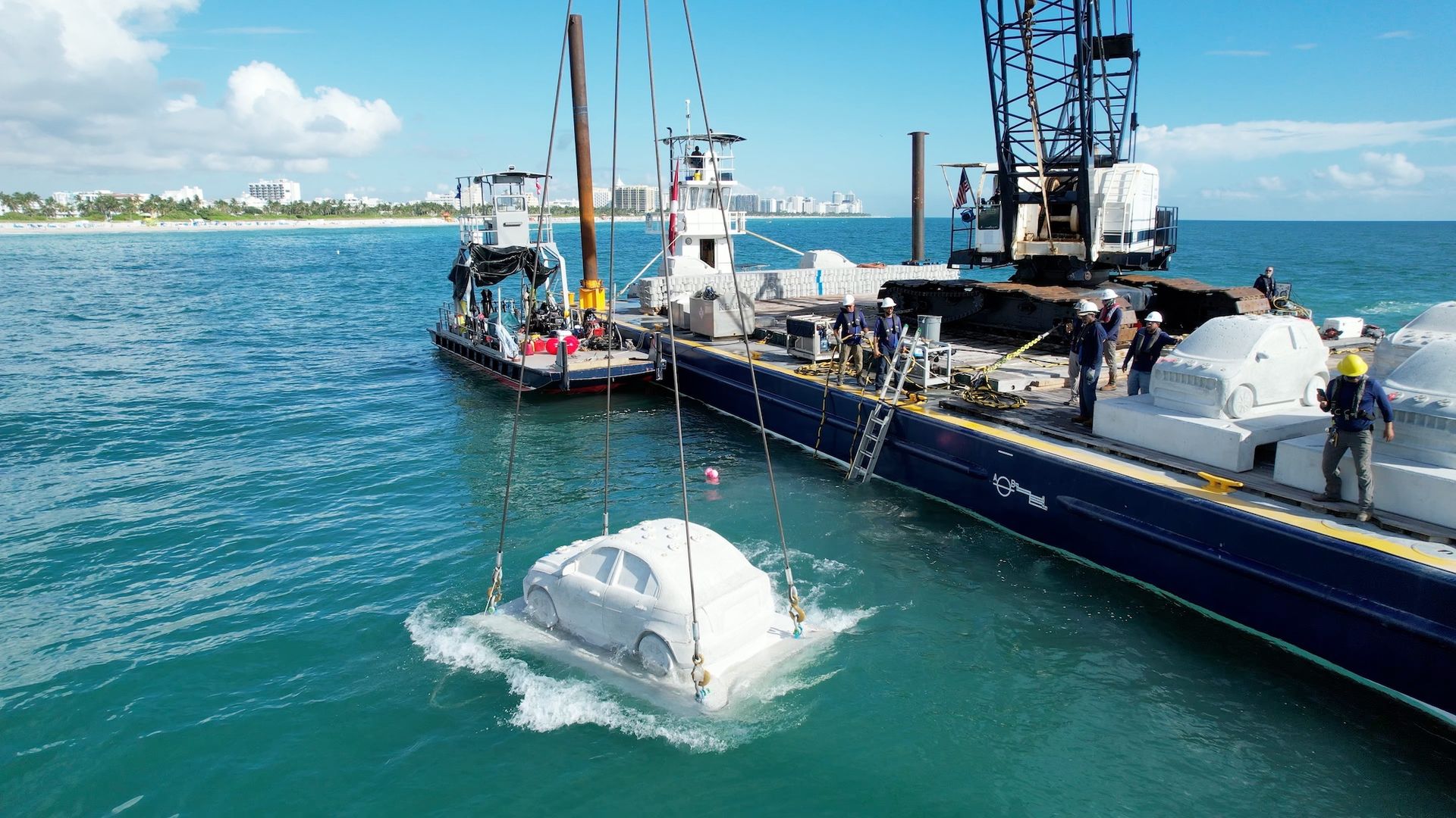 It took a 157ft-long construction barge, heavy-lift cranes and impeccable logistics to submerge Erlich’s 22 cars off the coast of Miami Beach, between 4th and 5th Streets, in late October. Within minutes of being installed, fish began swimming curiously around the cars’ hollow shells.