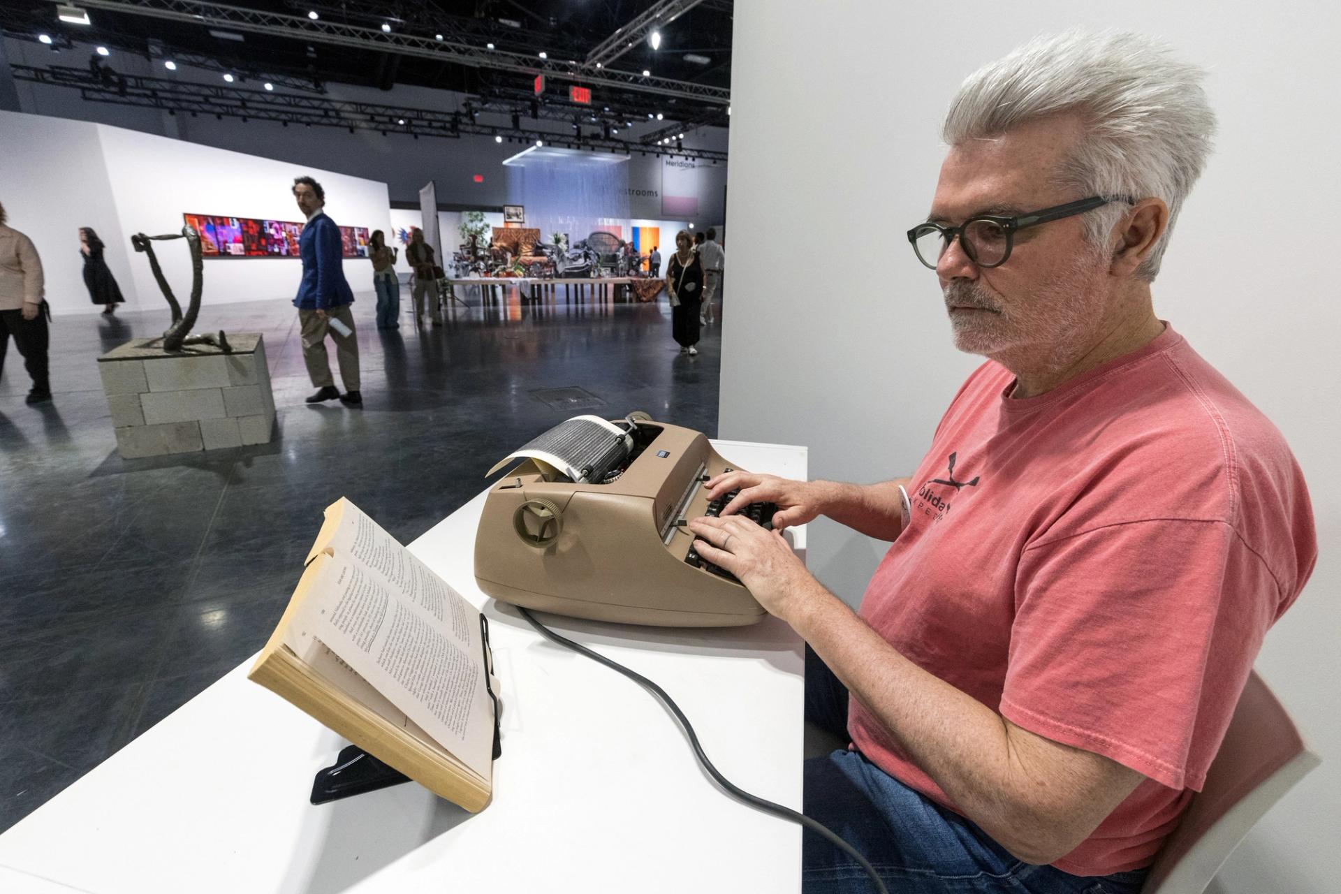 In a corner of Cristin Tierney’s stand, the artist Tim Youd is busy at work all week on one of his typewriter performances, which involves typing the entirety of Hunter S. Thompson’s 1973 book Fear and Loathing on the Campaign Trail ’72 onto a single sheet of paper. Appropriately, the gonzo journalist’s account of the 1972 US presidential election reaches its climax at the Miami Beach Convention Center, which held both the Democratic and Republican party conventions that year.