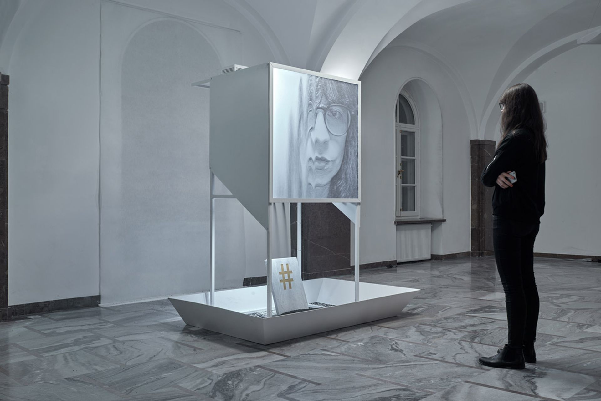 Another of panGenerator’s works that directly responds to social media is the installation Hash to ash (2017), which invites viewers to take a selfie that appears on a screen before seemingly melting and turning into ash, which is released from the monitor onto the floor. A stone plaque with a hashtag symbol engraved onto it, combined with the grey dust, creates the effect of a grave. The work takes aim at the widespread and superficial selfie culture that has reigned since the dawn of social media as well as highlighting the fragility of digital photos. “It’s so easy now to take photos and post them, and then we just upload them to the cloud, and we assume that they’re going to be there forever. So we don't curate photos of ourselves like we used to do, making family photo albums or whatnot,” Koźniewski says.
