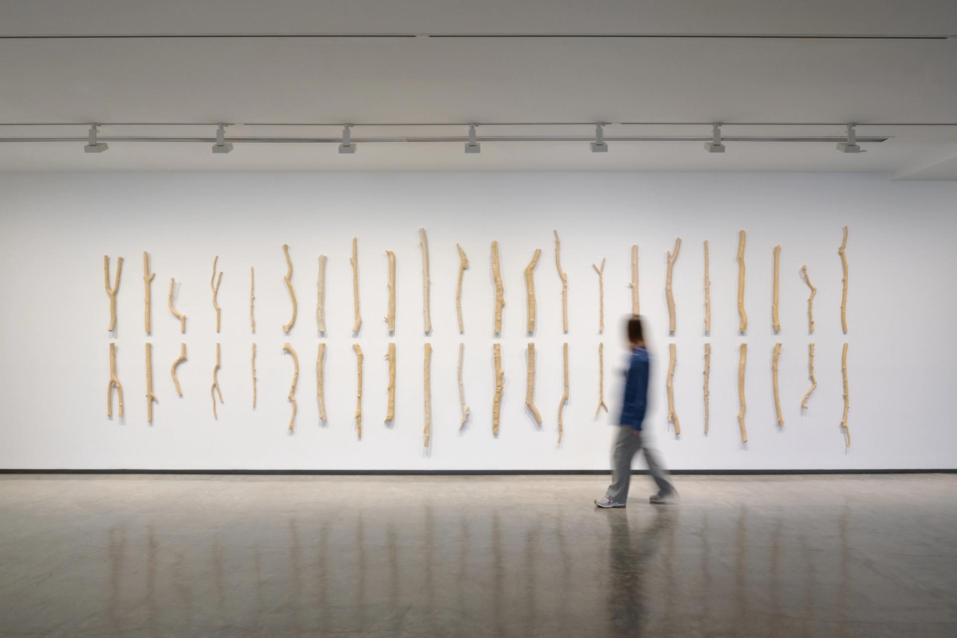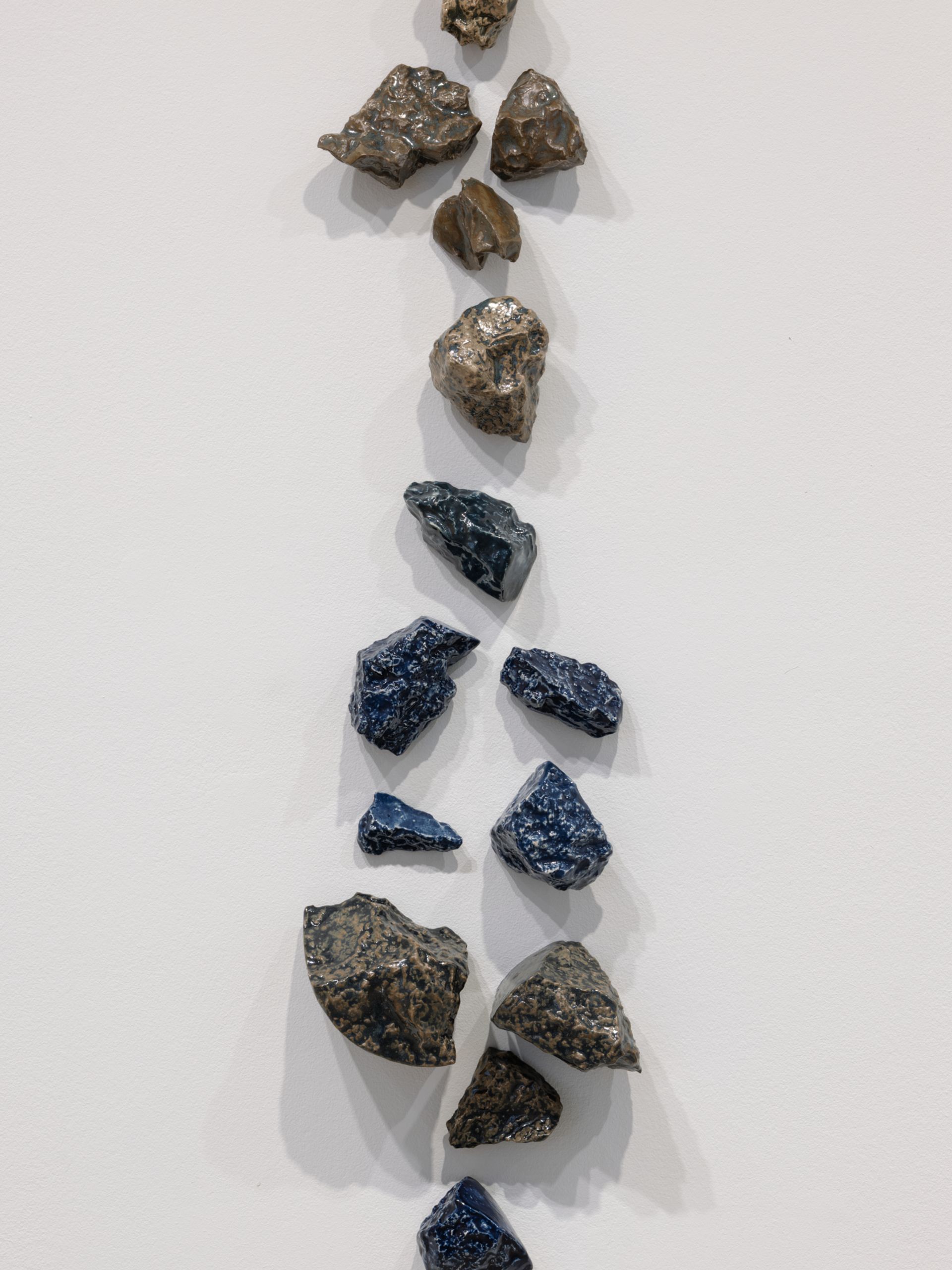 The current MCA Australia show focuses on the multifarious histories and geologies of rivers and waterways; and to make the dramatic wall-based Seine River Basin (2019), commissioned by the Centre Pompidou in 2019 and now part of MCA Australia’s permanent collection, Smith worked with an ecologist, an arborist and a local environmental organisation to delve into the chemical and social history of the River Seine and its tributaries. Having first created replicas in Limoges stoneware of tree branches growing alongside the river and floating in the network of waterways in and around Paris, she then glazed these ceramic facsimiles using ash derived from burning the original specimens. The resulting installation is arranged to evoke a line of trees mirrored in water, while the glazed surfaces reflect the unique chemical makeup of their environment, acting as a visual register of the substances—both nutrients and pollutants—that had been absorbed by the original specimen and become lodged like mineral memories in its cellular structure. As Smith says, “glazed ceramics have this alchemical ability to transmute one thing into another, and in the process show us something that we might not have been able to see with our own eyes”.