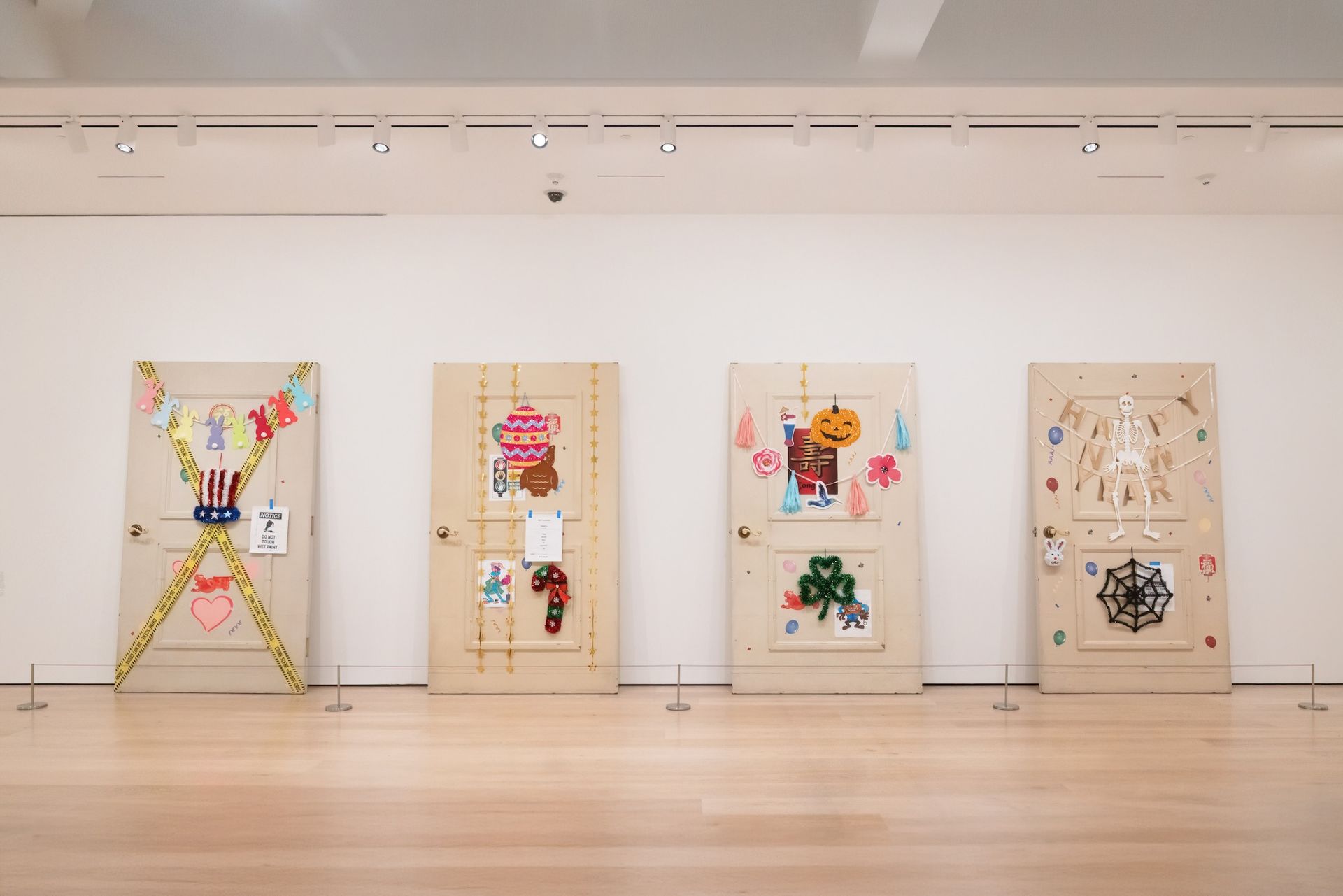 Humour can lighten up the grim present, and Amanda Ross-Ho’s Untitled Thresholds (FOUR SEASONS) (2025) has humour—and cultural mashups—in spades. Here, she has made four versions of her father’s door at his memory-care facility at twice their actual size, each decorated in a riotous array of holiday and consumer-culture trinkets. The doors lean against a wall, placed side by side, dwarfing the viewer with their pop-culture pastiche. On one, there are the words “Happy New Year” overlaid with a Halloween skeleton and, beneath that, a black spiderweb. Depictions of party balloons are scattered throughout.