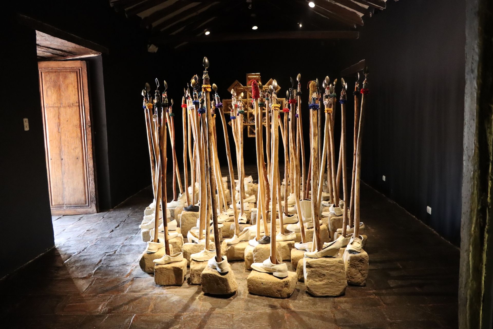 Vicente’s Infinite Steps is a deeply personal installation that confronts the devastation wrought by Covid-19 in Ecuador, one of the earliest epicentres of the pandemic in Latin America. The solemn work is comprised of walking sticks mounted on stone bases, each anchored by a single shoe. The handles are wrapped with multicoloured, doll-like figurines affixed to metal spoons, forming a silent procession of human figures.