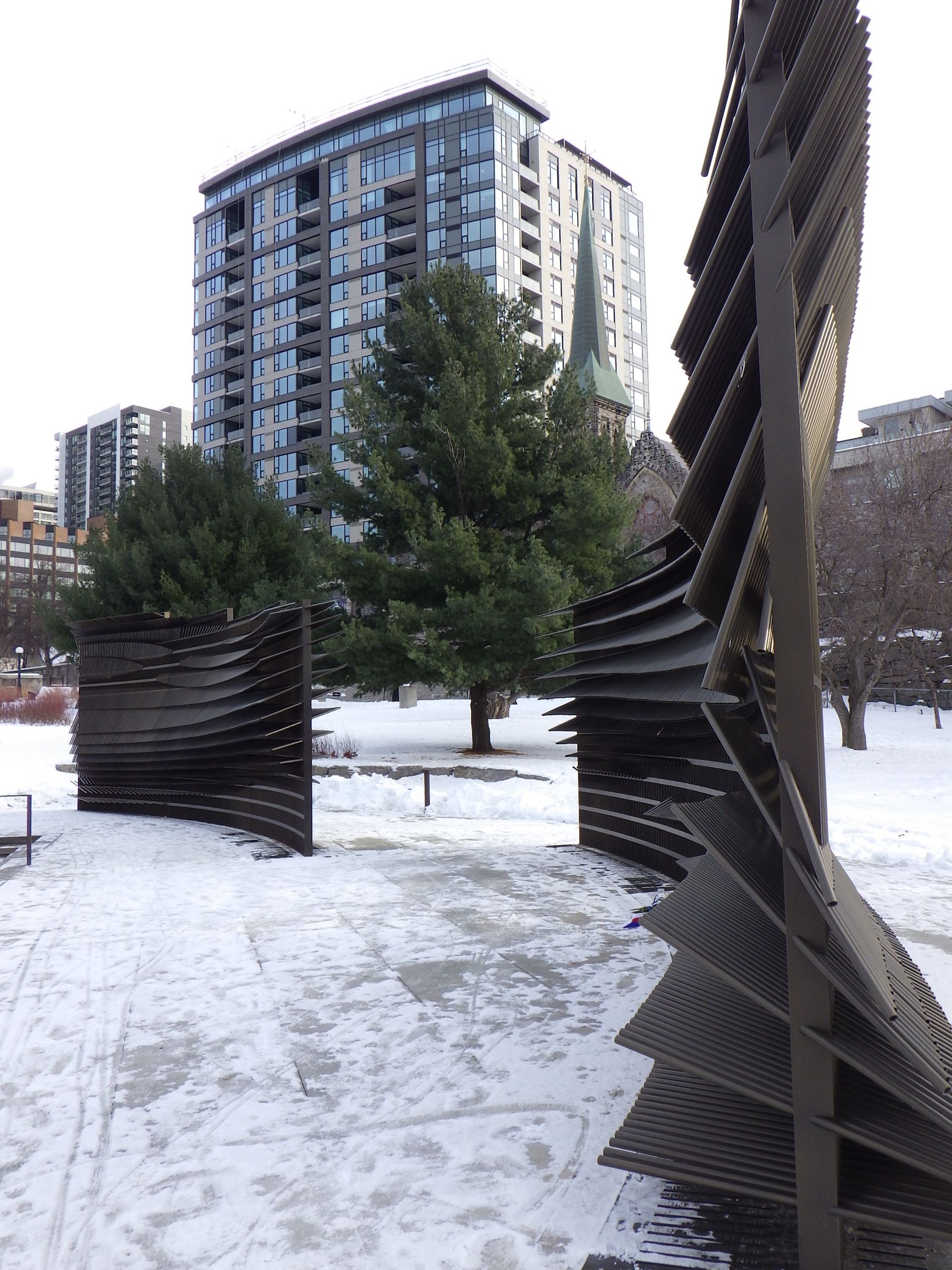 The initial concept for the memorial by Abstrakt Studio Architecture, which consisted of several “folded” rows of concrete covered in 100 million “memory squares” intended to honour 100 million victims of communism, was scrapped due to its “oppressive” design. The final design, by Paul Raff, is named Arc of Memory and described in a Heritage Ministry press release as “a dynamic living calendar, designed to capture the many moments of suffering and injustice to be remembered, in solace and gratitude”. The structure “is divided in the middle at the winter solstice, the darkest day of the year, inviting visitors to step through in a metaphorical journey from darkness and oppression to light and liberty”.