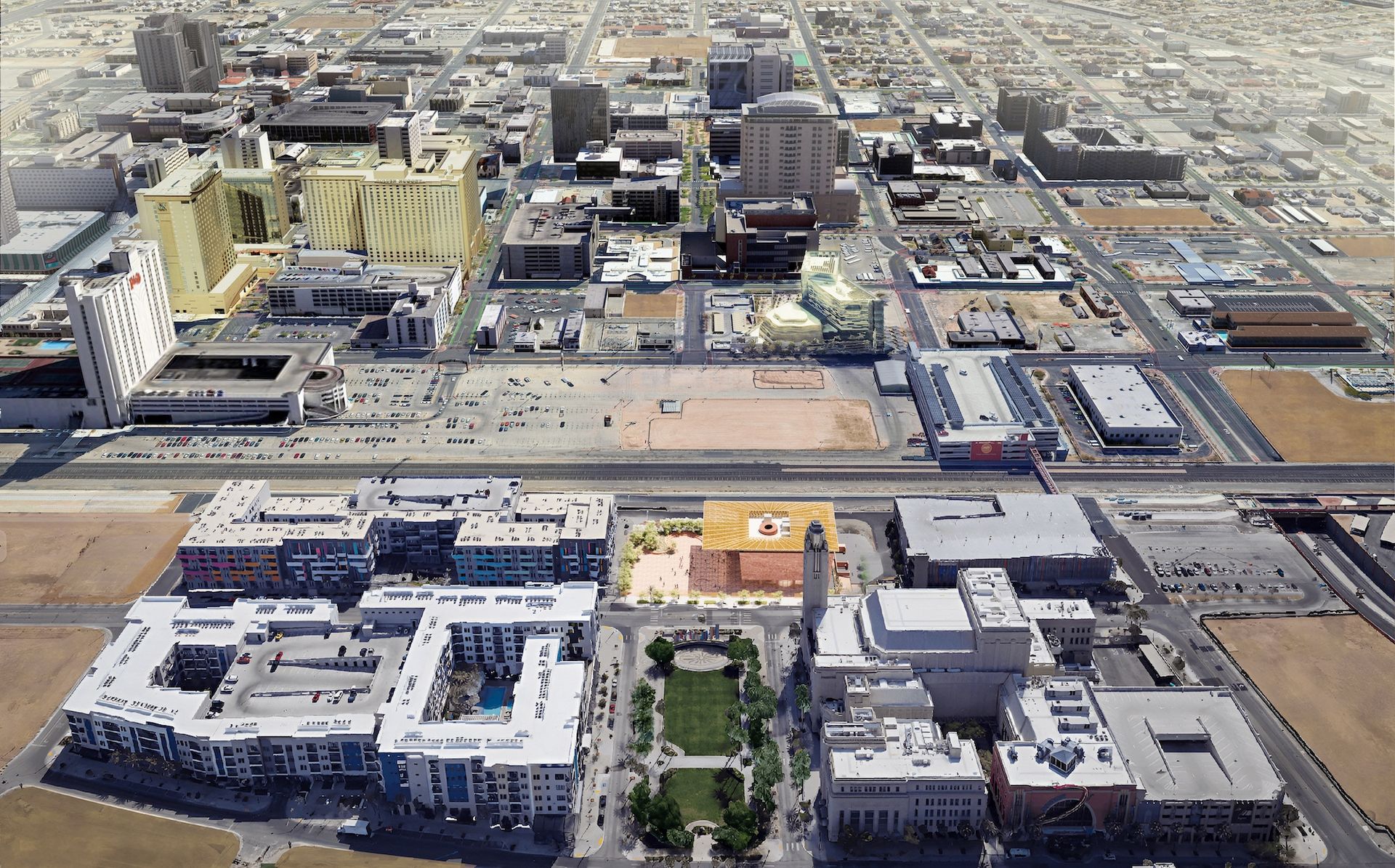 Aerial view of the future Las Vegas Museum of Art (centre) in Downtown Las Vegas © Kéré Architecture, Courtesy of Las Vegas Museum of Art