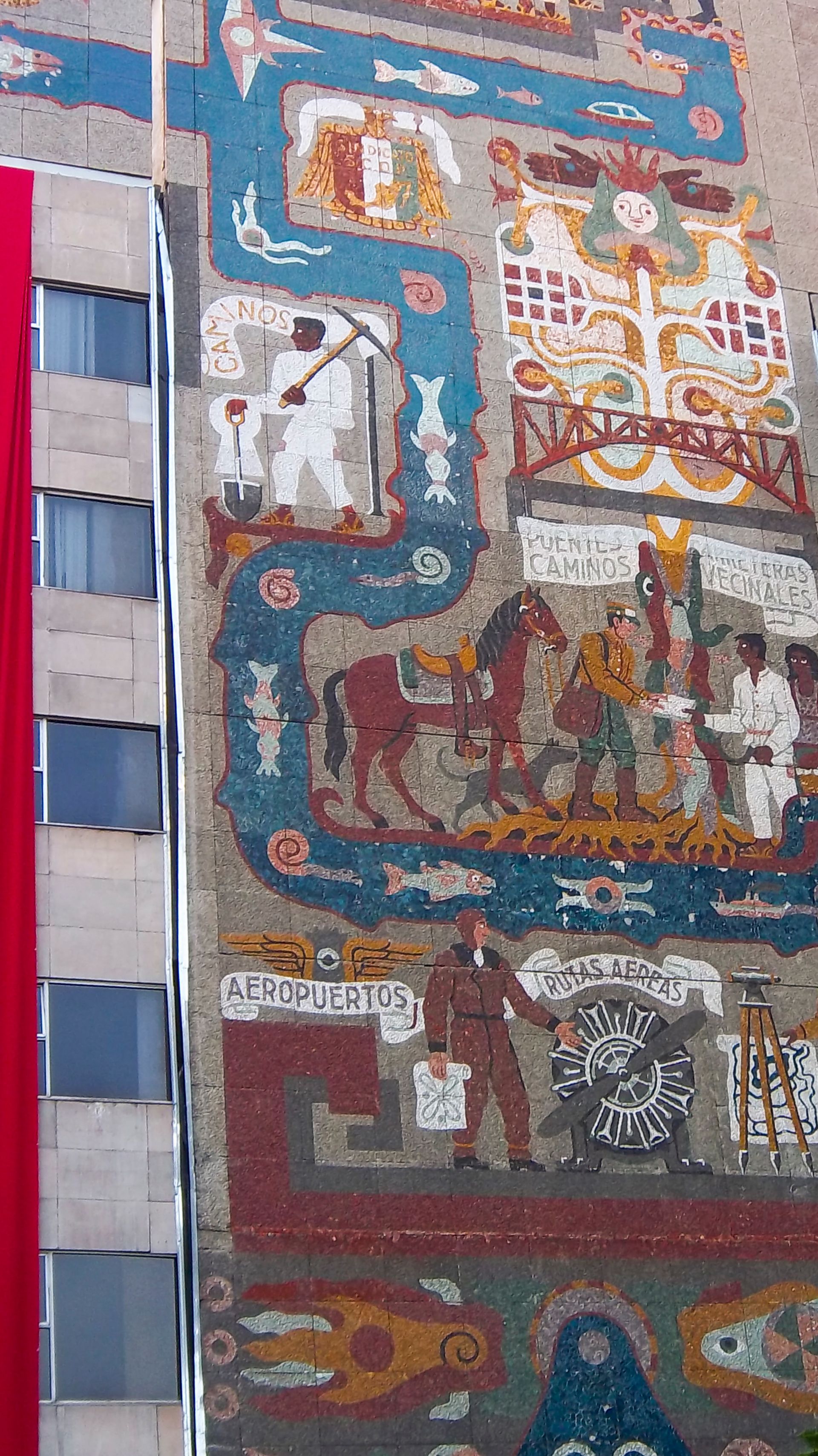 From the outset, Centro SCOP had its problems. The complex was built atop an unfinished hospital with a defective foundation. On 19 September 1985, an earthquake caused the main building’s top levels to collapse, killing at least 14 workers and destroying a number of murals. Between 1988 and 1995, many murals were reconstructed—with alterations—and installed on temporary structures. In 2017, exactly 32 years to the day after the first disaster, a second earthquake again devastated the compound.