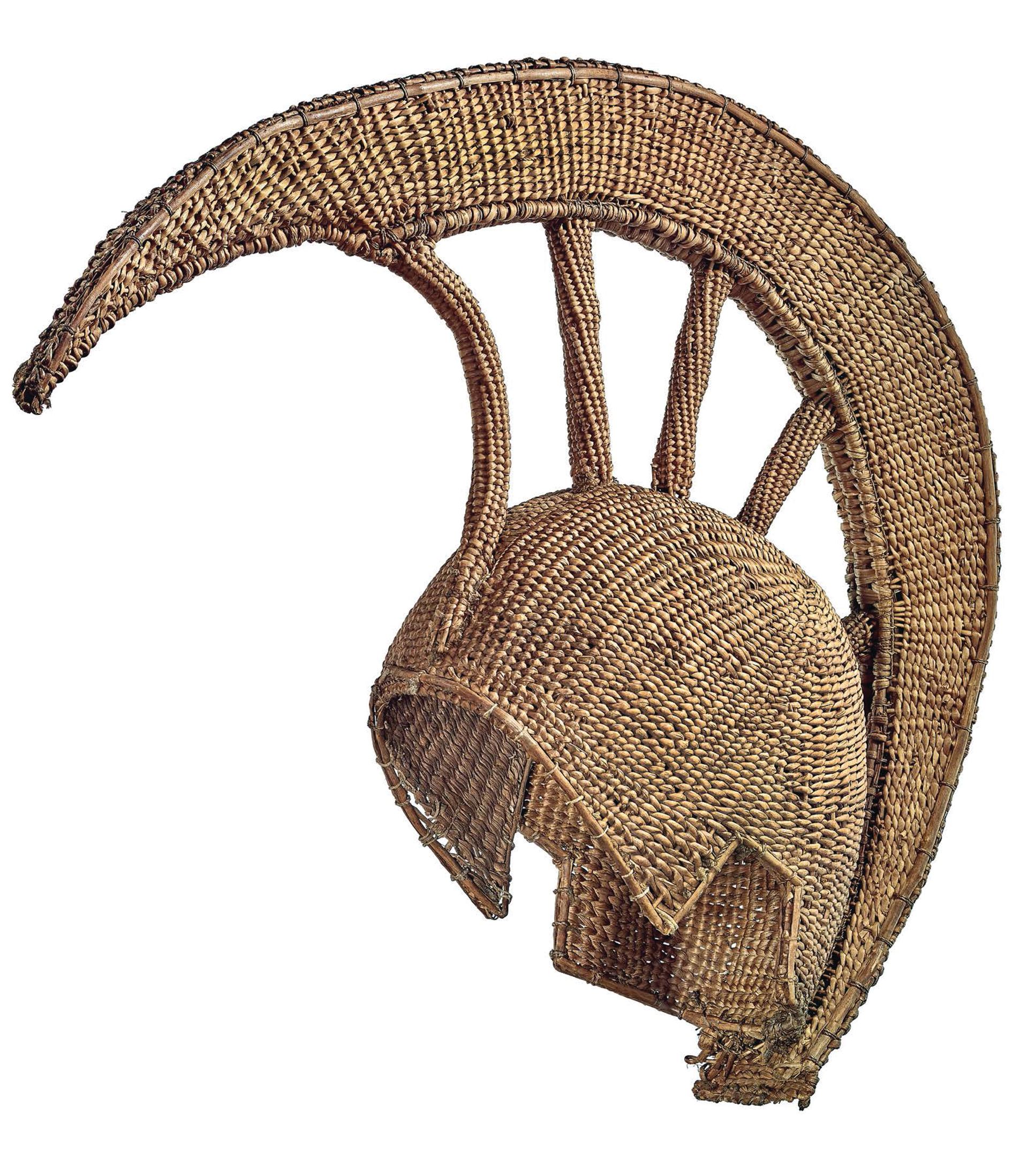 This tall, crested helmet is one of over 150 mea kupuna (ancestral works) featured in the book and the exhibition; the exact trajectory that carried it from Hawaii to London is only partially known. It may have been made for an unidentified Hawaiian chief and collected during the voyages of Captain George Vancouver to Hawaii in the late 18th century. Little was known about its making until the contemporary artists Kumulā’au Sing and Haunani Balino-Sing came to the British Museum in 2022.