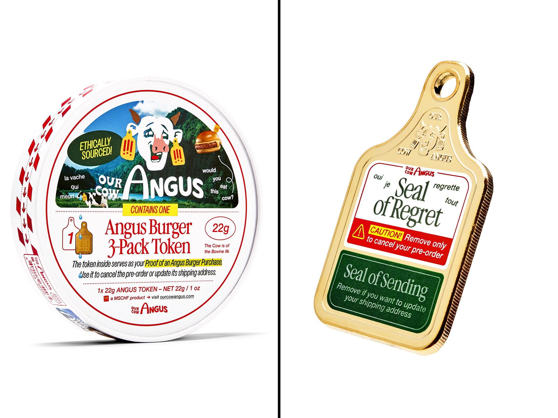 A burger token (right) and burger token packaging (left) for MSCHF's project Our Cow Angus (2024-26) Courtesy MSCHF