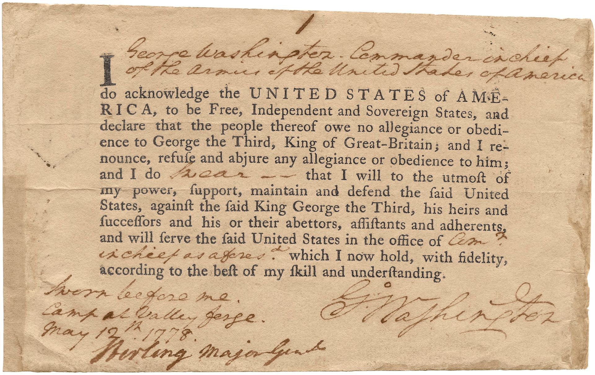 Oath of allegiance and fidelity signed by General George Washington while encamped and in command of the Continental Army at Valley Forge, Pennsylvania, in 1778 Courtesy the National Archives