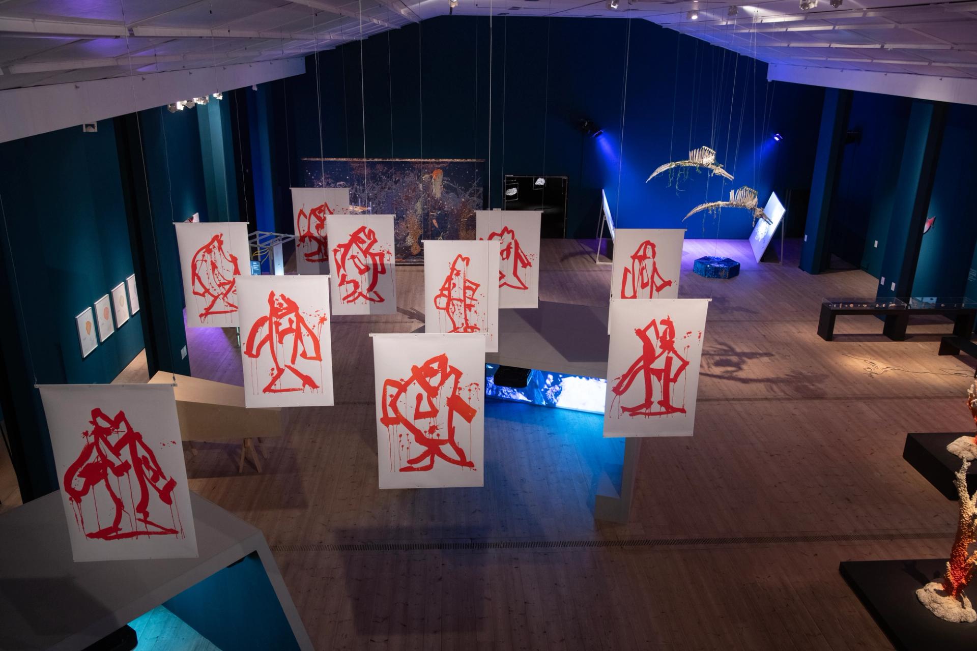 In between, the show encompasses multifarious ocean habitats and marine ecosystems from near shore and intertidal zones to coral reefs, the open sea and underwater terrains. Joan Jonas offers an exuberant tribute to the biodiversity, intelligence and complex ecologies of ocean life with Moving Off The Land II (2019), an installation of drawings and films; while Taloi Havini and Michael Toisuta’s videos explore the regeneration of coral reefs at night through mass-coral spawning. Less celebratory is Shezad Dawood’s examination using neon, sculpture and commercial beach towels to address the consequences of both climate change and global beach tourism on marine ecosystems; while Otobong Nkanga—in her enormous, richly detailed woven tapestry of a subaquatic landscape, in which severed limbs and mechanical forms are integrated with luxuriant plant and coral life—offers a stark reminder of the fraught and complicated histories of extraction and displacement that are now indelibly associated with the world’s oceans.