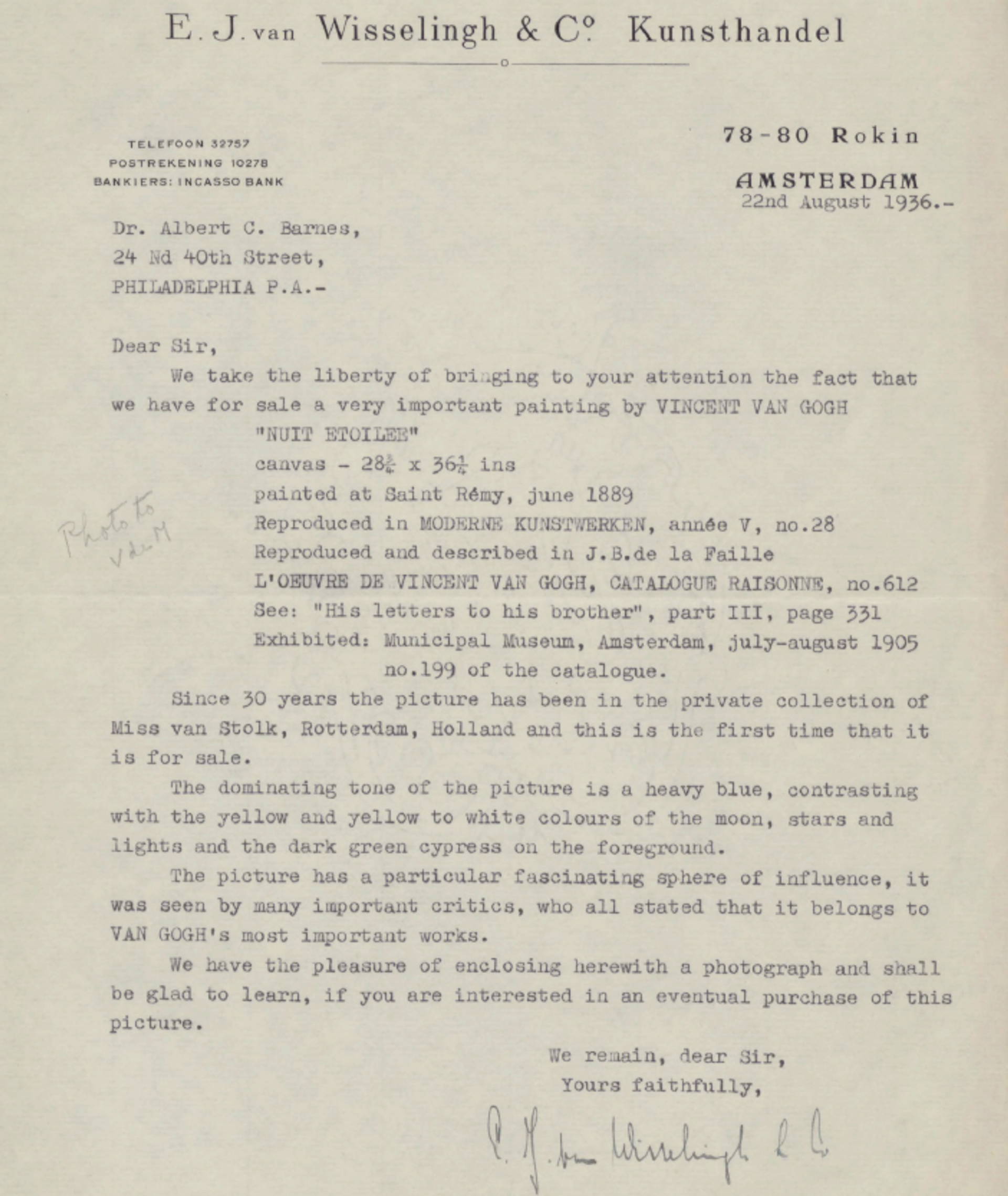 Barnes later had the chance to acquire another Van Gogh nocturnal scene. In 1936, the Van Wisselingh gallery in Amsterdam wrote to Barnes, to “take the liberty of bringing to your attention” the fact that Starry Night was available for sale. They explained that the painting had been in a Rotterdam private collection for 30 years and enclosed a black-and-white photograph.
