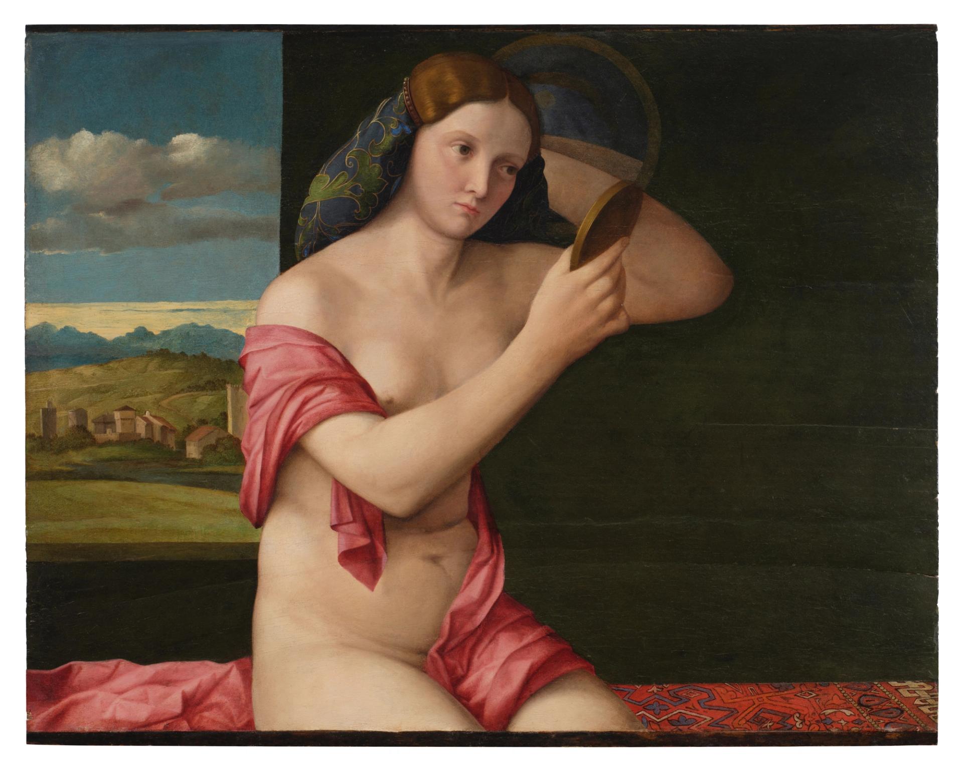 Depicting a figure who is nearly nude, the panel painting includes signature elements associated with the Venetian school, like a sumptuous Turkish carpet and a beguiling window view suggestive of Venice’s hinterland, the Terrafirma, replete with distant mountains.