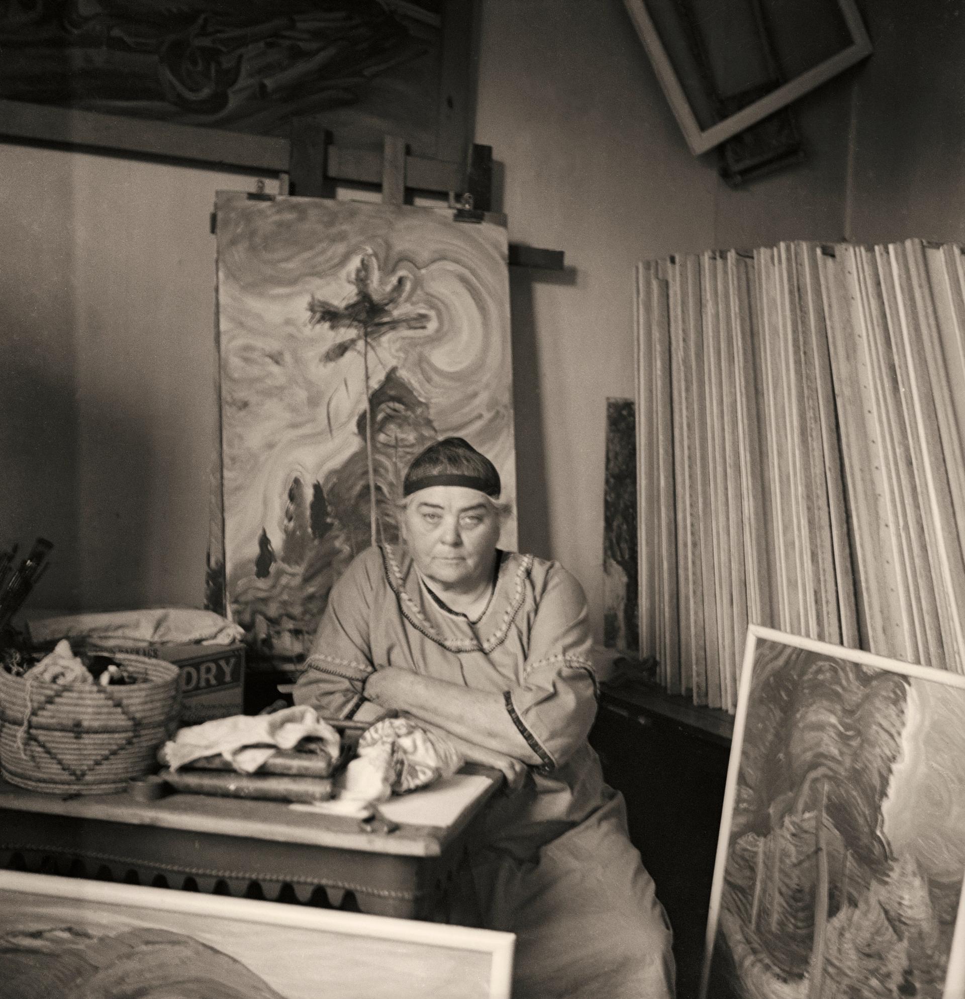 A photography of Emily Carr in Her Studio in 1939 by Harold Mortimer-Lamb Collection of the Vancouver Art Gallery, Gift of Claudia Beck and Andrew Gruft