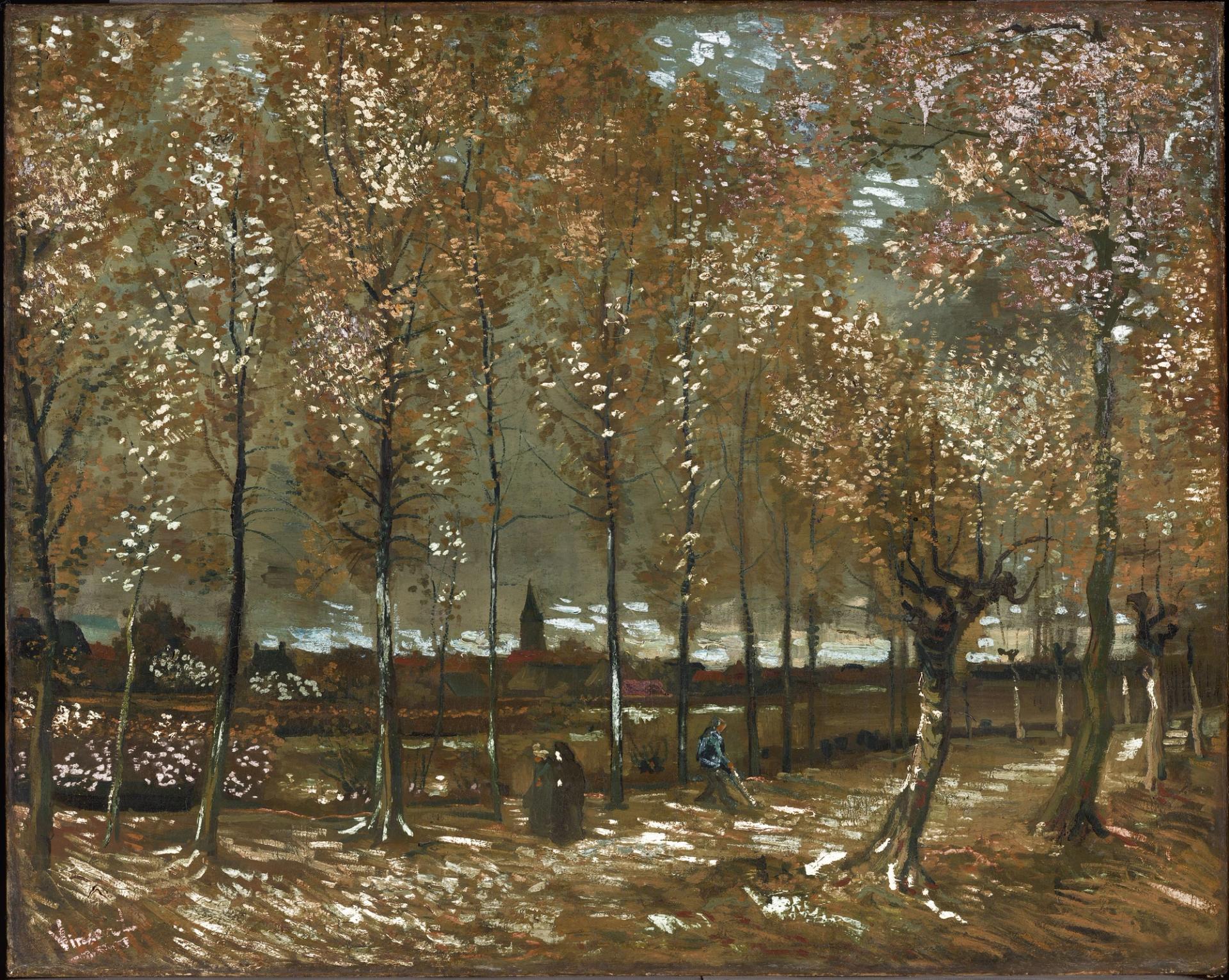 Just over a year after creating the original picture, Van Gogh reused the canvas, by painting an autumnal scene of an avenue of trees with three figures. Occasionally the artist reused his canvases to save money, but it seems surprising that he did so in this case, since it appears to have been a successful original composition. It would later be singled out for praise by his artist friend Anton van Rappard, who wrote that the church tower scene ”struck me so deeply”.
