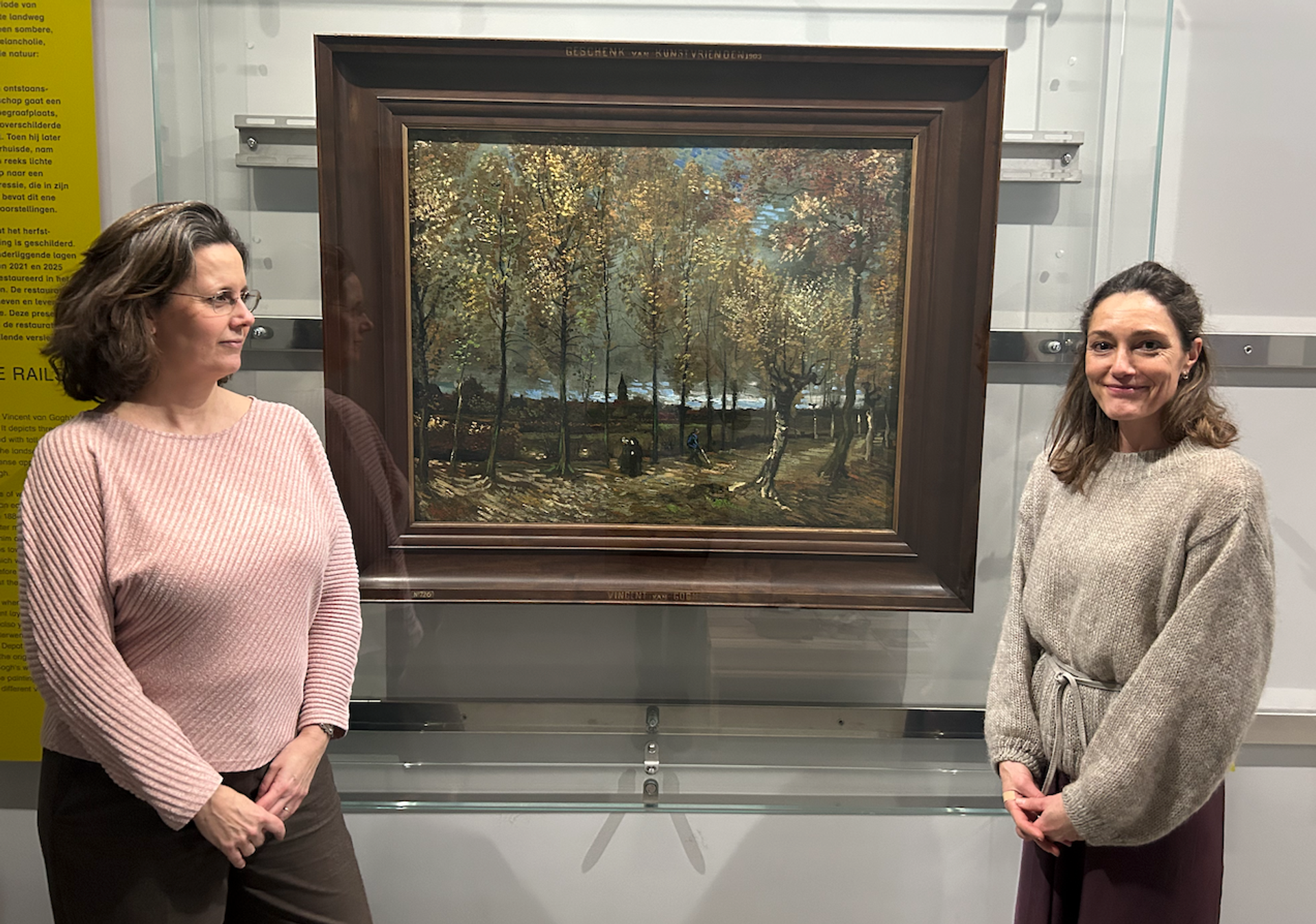 The newly conserved Poplars near Nuenen now on display at the Boijmans Van Beuningen Museum's depot, with head of collections and research Sandra Kisters and conservator Erika Smeenk-Metz