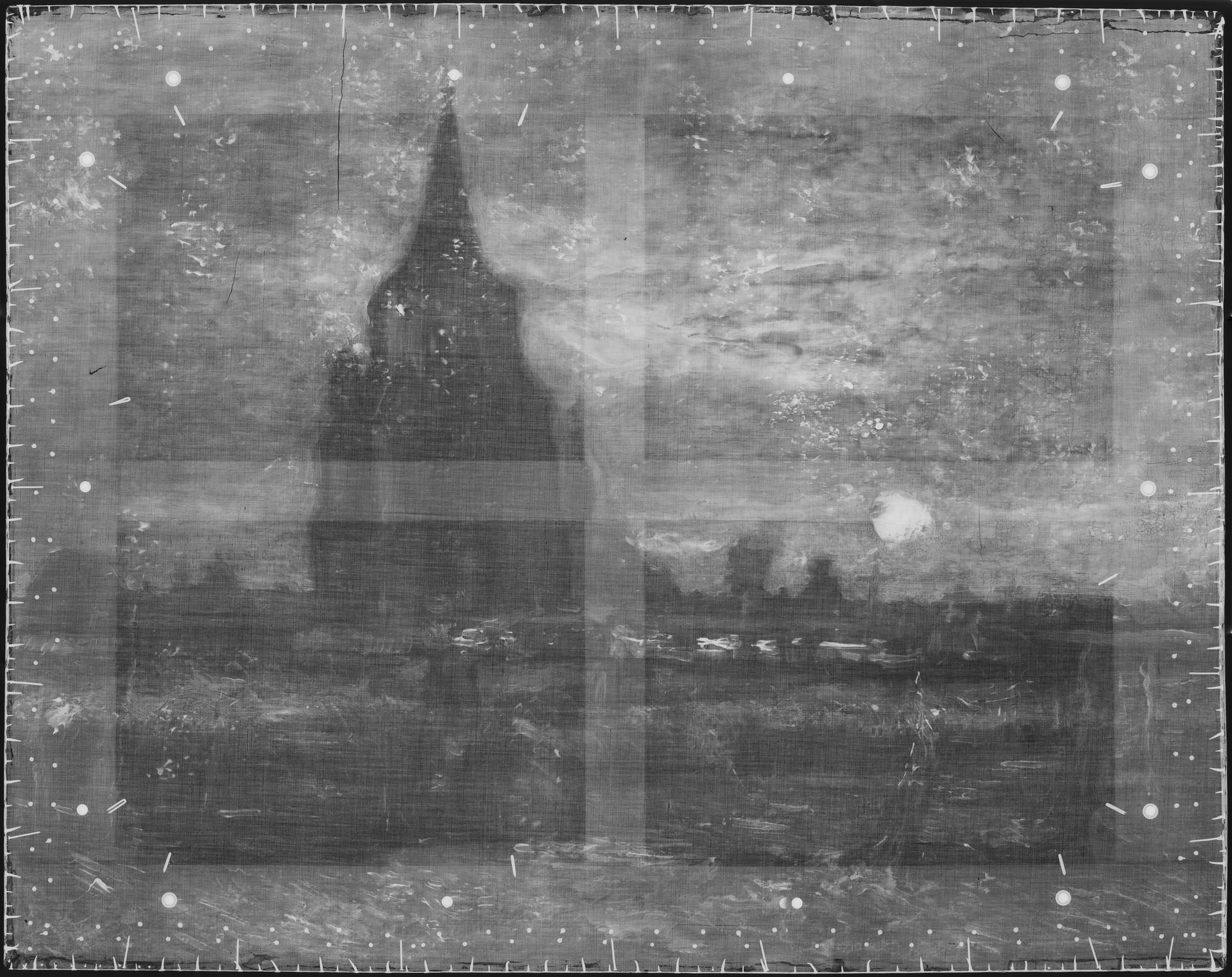 X-ray image of Poplars near Nuenen, revealing the original composition (July 1884) of the church tower and graveyard
