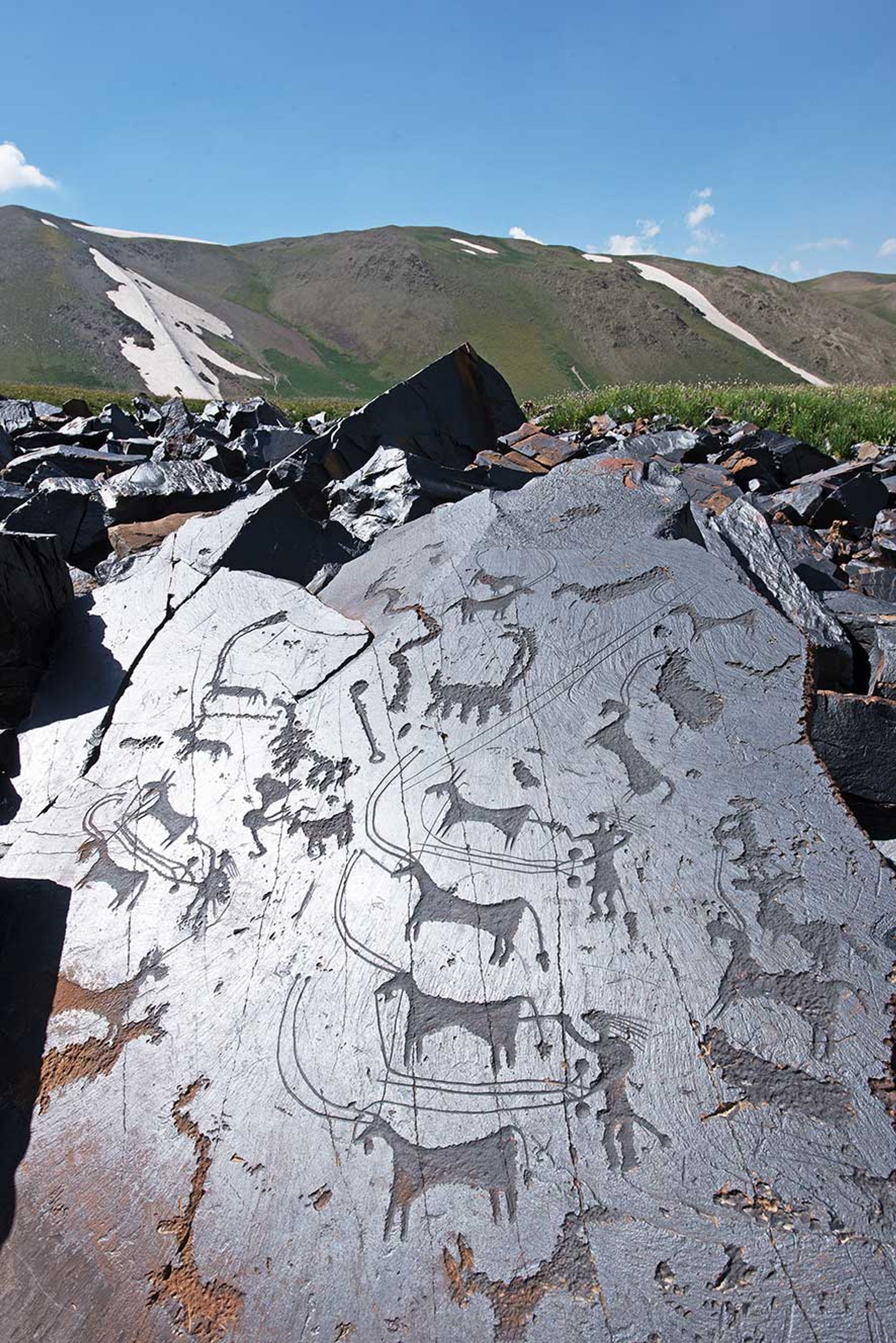 Remarkably well-preserved Bronze Age rock art from Saimaluu Tash in Kyrgyzstan depicts scenes of ploughing © Christoph Baumer