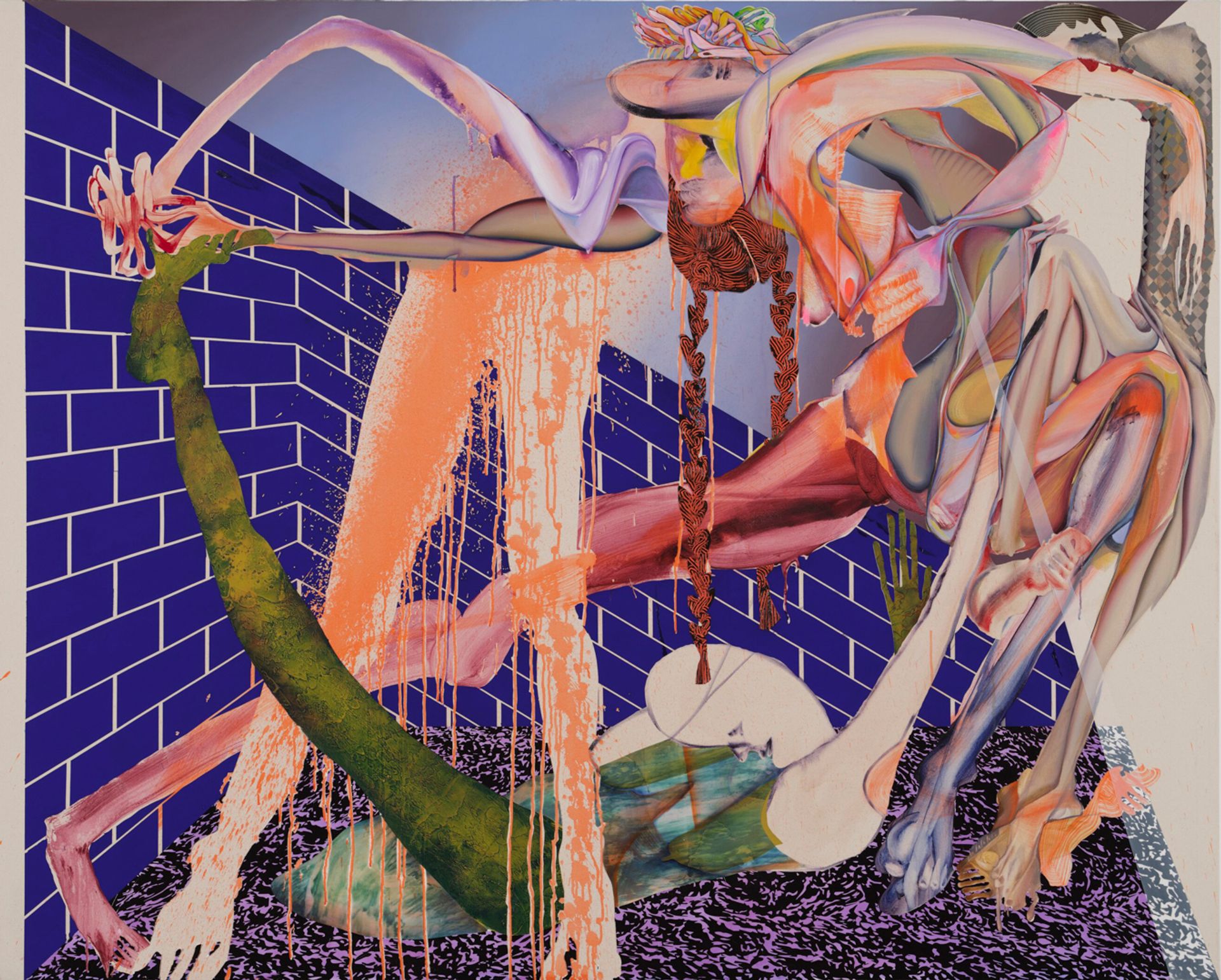 Christina Quarles has a way of stretching paint to its limits. Biracial and queer, she gives her images of bodies an elasticity and fluidity that is stunning. At the same time, she explores the plasticity of acrylic paint, layered on the canvas like a second skin or applied over digitally generated stencils to look like large stickers—hence there is much talk about her work as collage, even when her medium is solely acrylic.