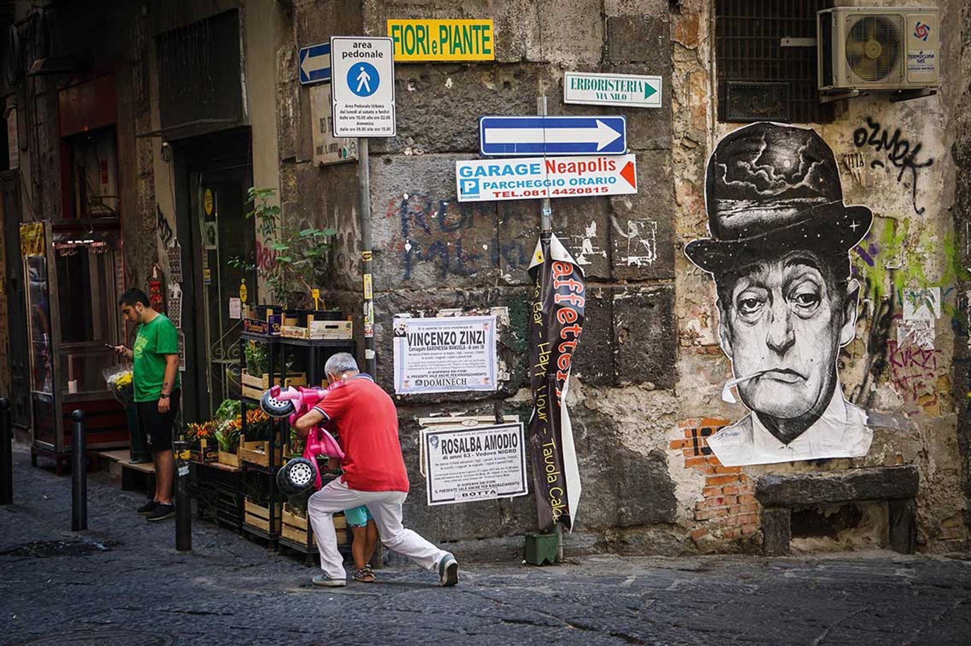 A mural of Totó in Naples, where the comedian was born. His likeness has appeared on souvenirs and businesses such as pizzerias throughout the city