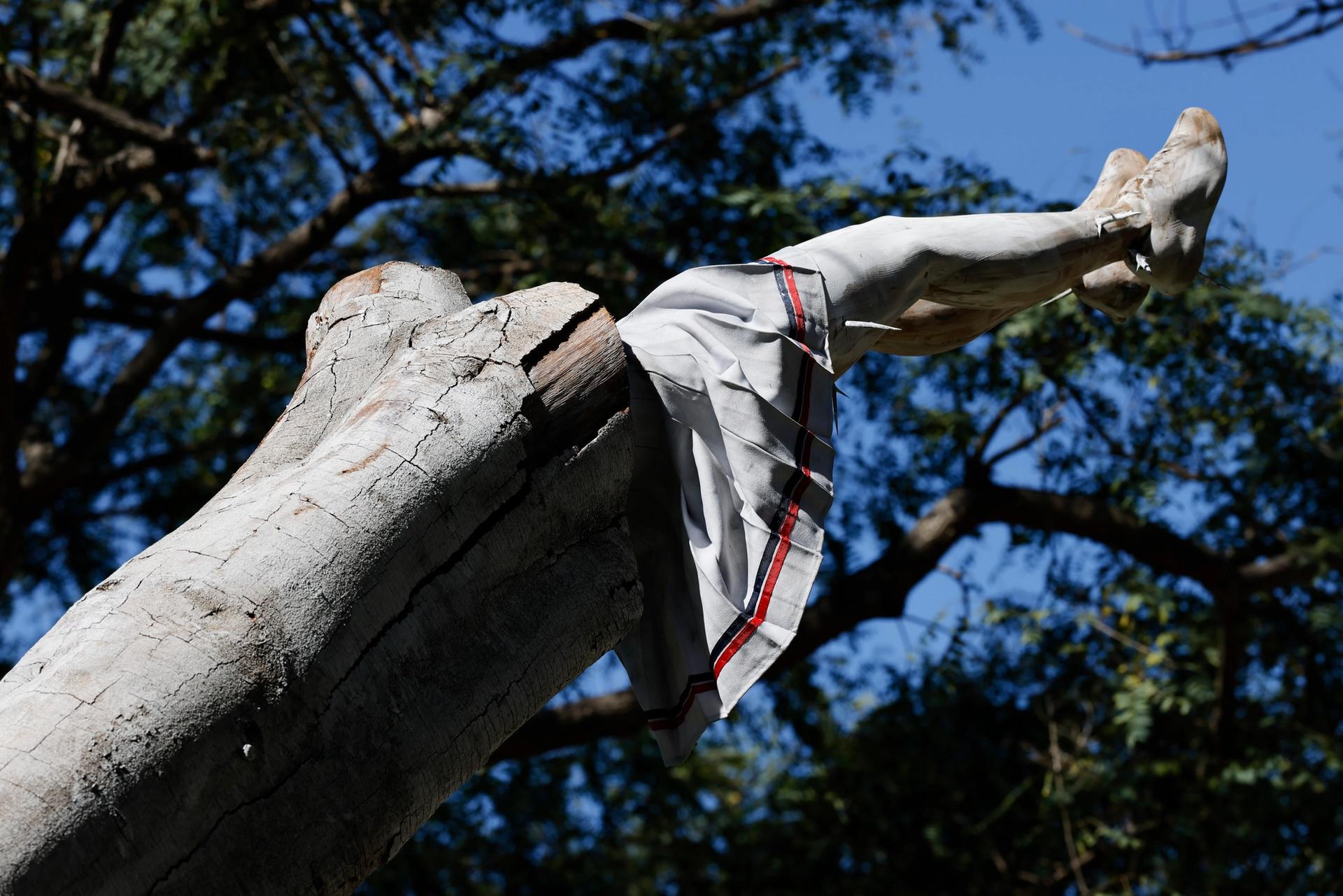Visitors passing a fallen tree as they approach the Frieze tent could be forgiven for missing the human legs protruding from its branches. Part of the fair’s public-art programming with Art Production Fund, Deadfall is the local artist Shana Hoehn’s first large-scale public sculpture. To create it, she carved the two pairs of legs into the dead limbs of a tree sourced from Santa Monica. The cheerleading skirts and tennis shoes—references to the artist’s childhood in East Texas—add to the spectacle of the piece.