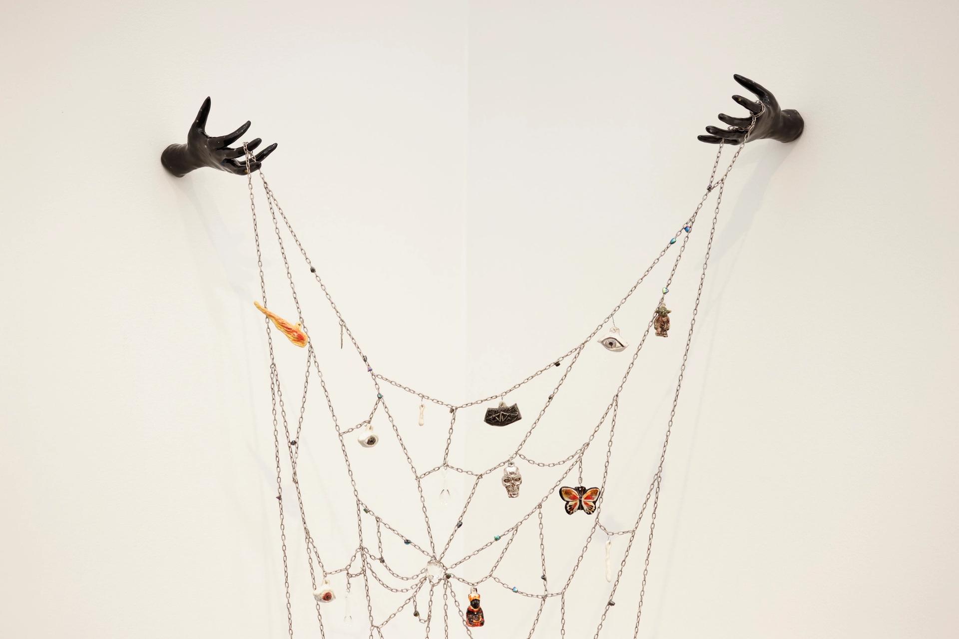 This spiderweb populated by handmade charms shows off the Guadalajara-based artist Alejandro García Contreras’s skills as a ceramicist. Each of the tiny sculptures—including evil eyes, gods and goddesses, butterflies, a snake and even Yoda—has a personal, symbolic meaning for the artist. Most he made himself but among them are a couple found objects, such as a piece of Japanese pottery. Held up by the hands of the universe, the intricate sculpture already sold to a notable collector for $8,000. García Contreras has more webs on view as part of his show at Anat Ebgi’s space on Wilshire Boulevard (until 4 April).