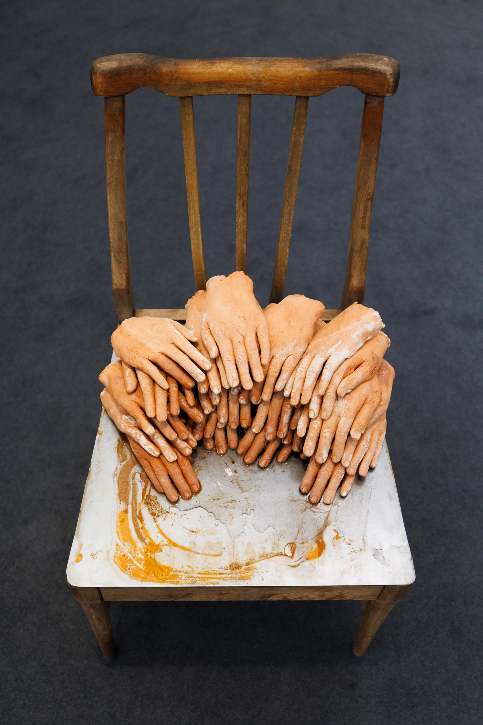 Anchoring the stand of the Tehran- and Toronto-based gallery Dastan is Roksana Pirouzmand’s sculptural fountain, which features water gently bubbling over ceramic casts of hands on a weathered chair. “Previous works of Roksana’s have been about intergenerational dialogue, and I like to see this work as the hands of elders on top trying to protect the others,” says the gallery’s founder, Hormoz Hematian. The work is priced at less than $15,000. Pirouzmand also has two current solo shows in Los Angeles—at Oxy Arts (until 11 April) and Joan (until 2 May).