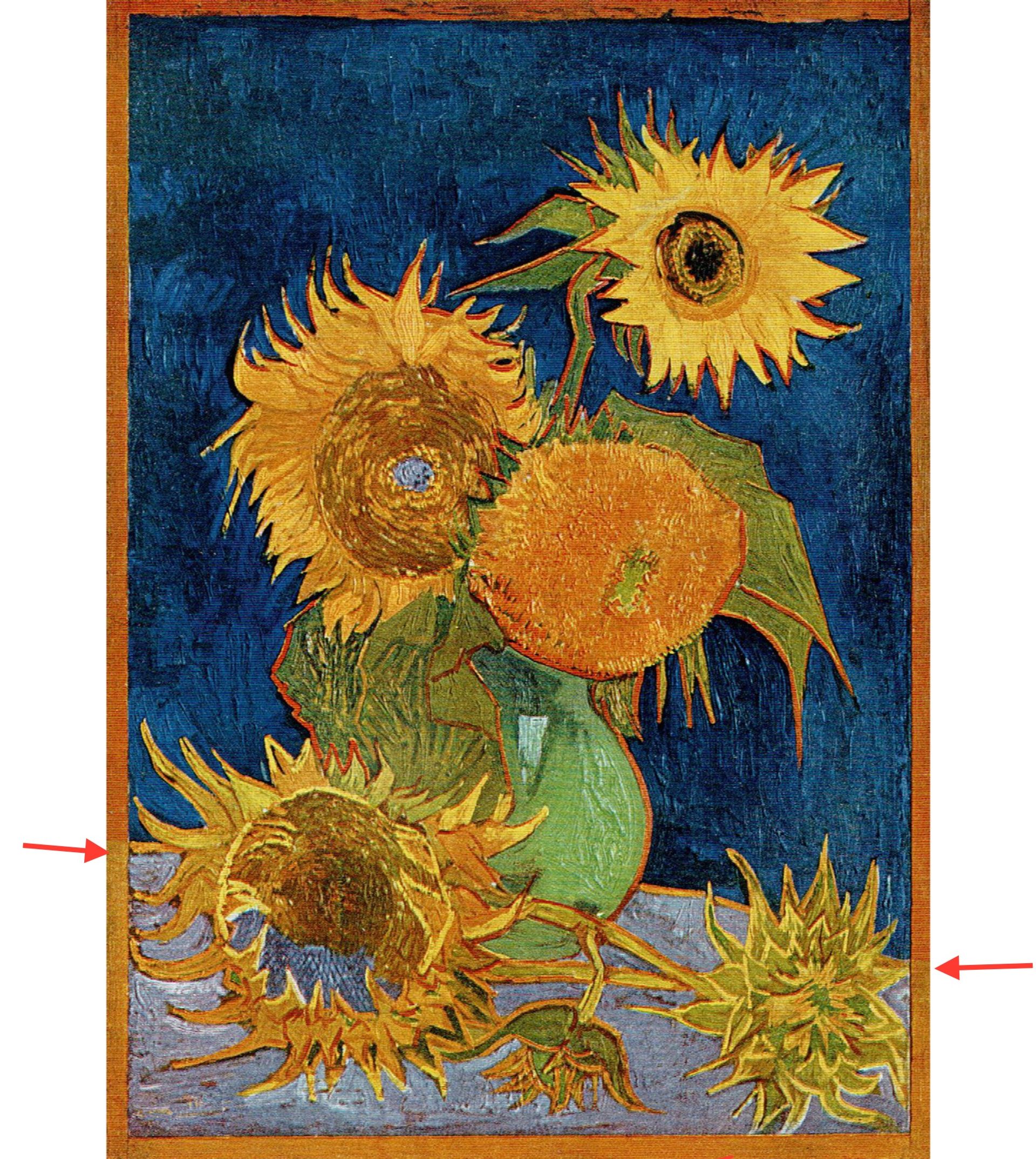 Van Gogh’s Six Sunflowers (August 1888) with the added narrow wooden frame: in colouring the frame he made it a lighter brown next to the light violet table and a darker brown next to the deep blue background