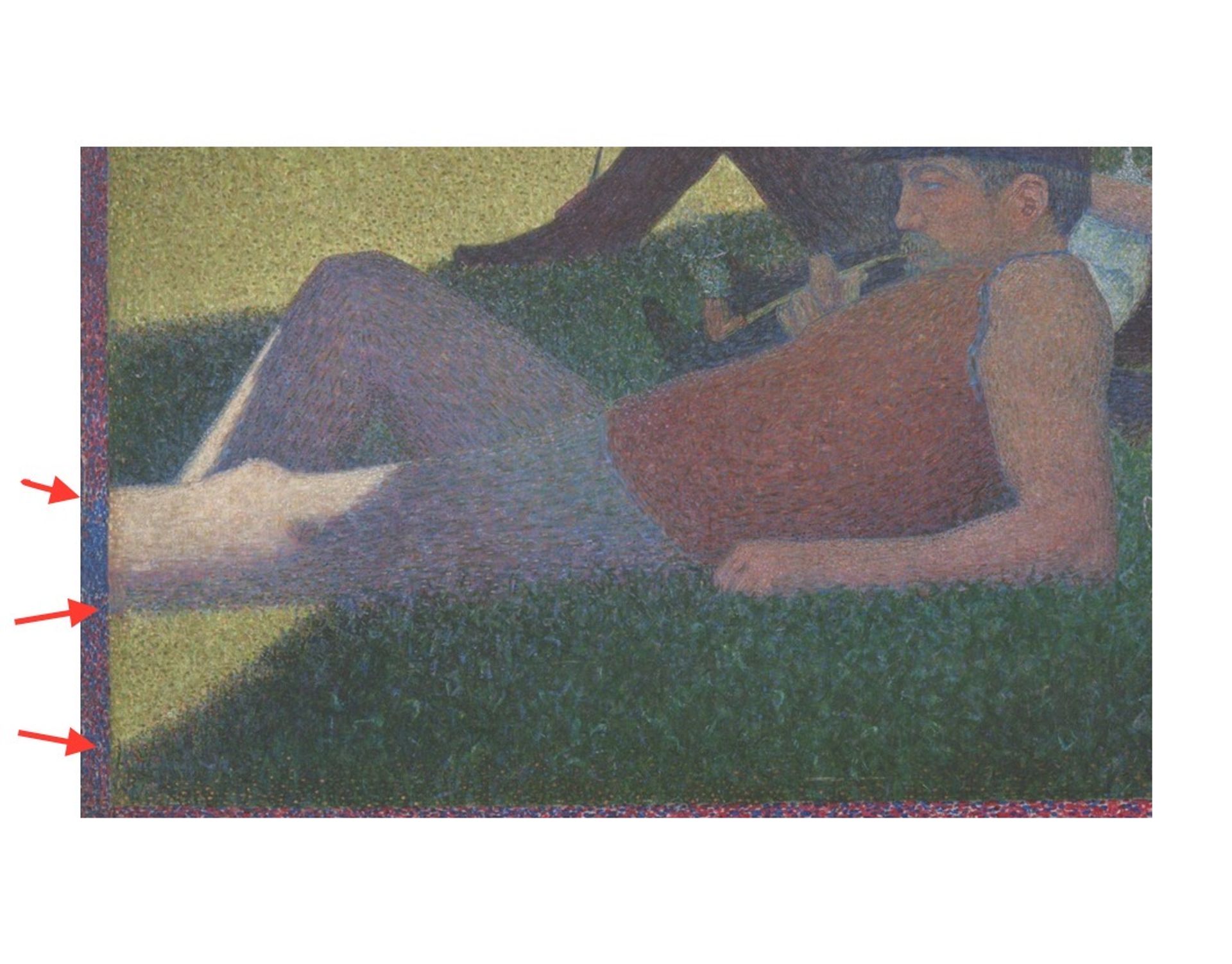 Detail of Seurat’s A Sunday on La Grande Jatte: Most of the added border is violet (a darker shade on the left by the sunlit grass and a lighter shade at the bottom by the shaded grass), but with blue next to the sunlit leg