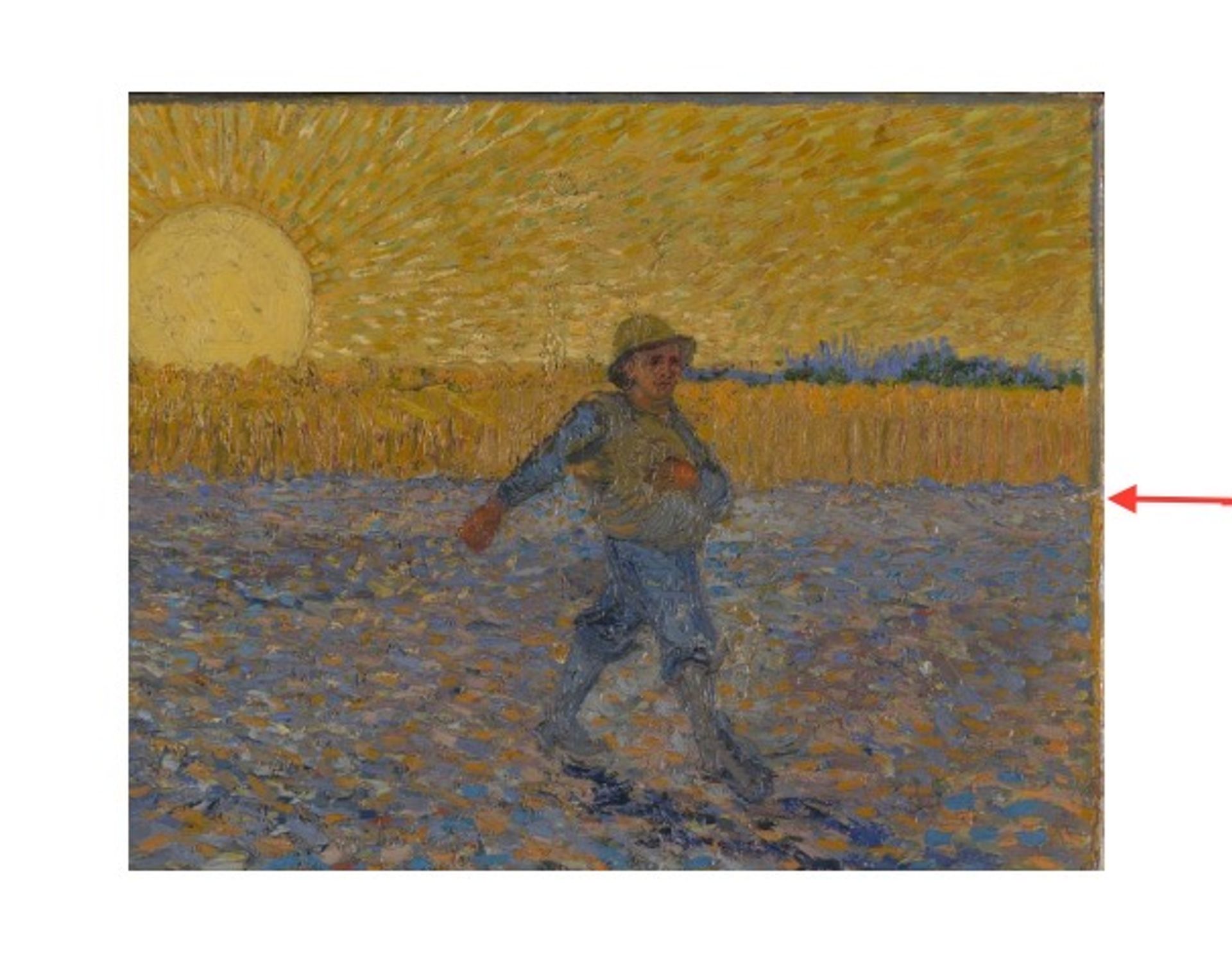 Detail of Van Gogh’s The Sower (June 1888): A dark edging border now lies next to the sunset sky and golden wheat, with an ochre border next to the blue-purple earth.