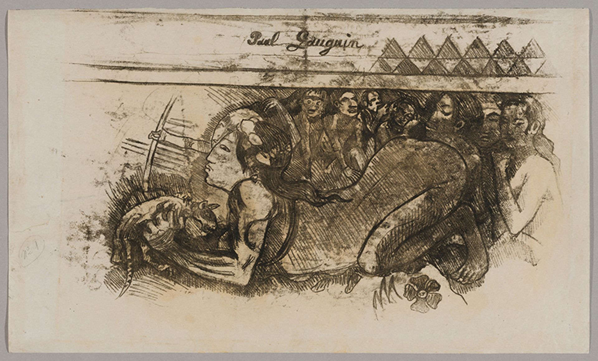 Some Gauguin specialists have suggested that the crouching woman was inspired by Polynesian sculpture. A rare example of this subject survives at the British Museum, where the wood carving of a naked figure (probably Hawaiian but possibly Tahitian) is described as a device to serve as a stand for holding a spear or a fishing rod. The image of a crouching woman also appears, once again with a serpent, in a Gauguin drawing: the sphinx-like Polynesian female in Woman with a Cat (around 1900), which is now at the Art Institute of Chicago.