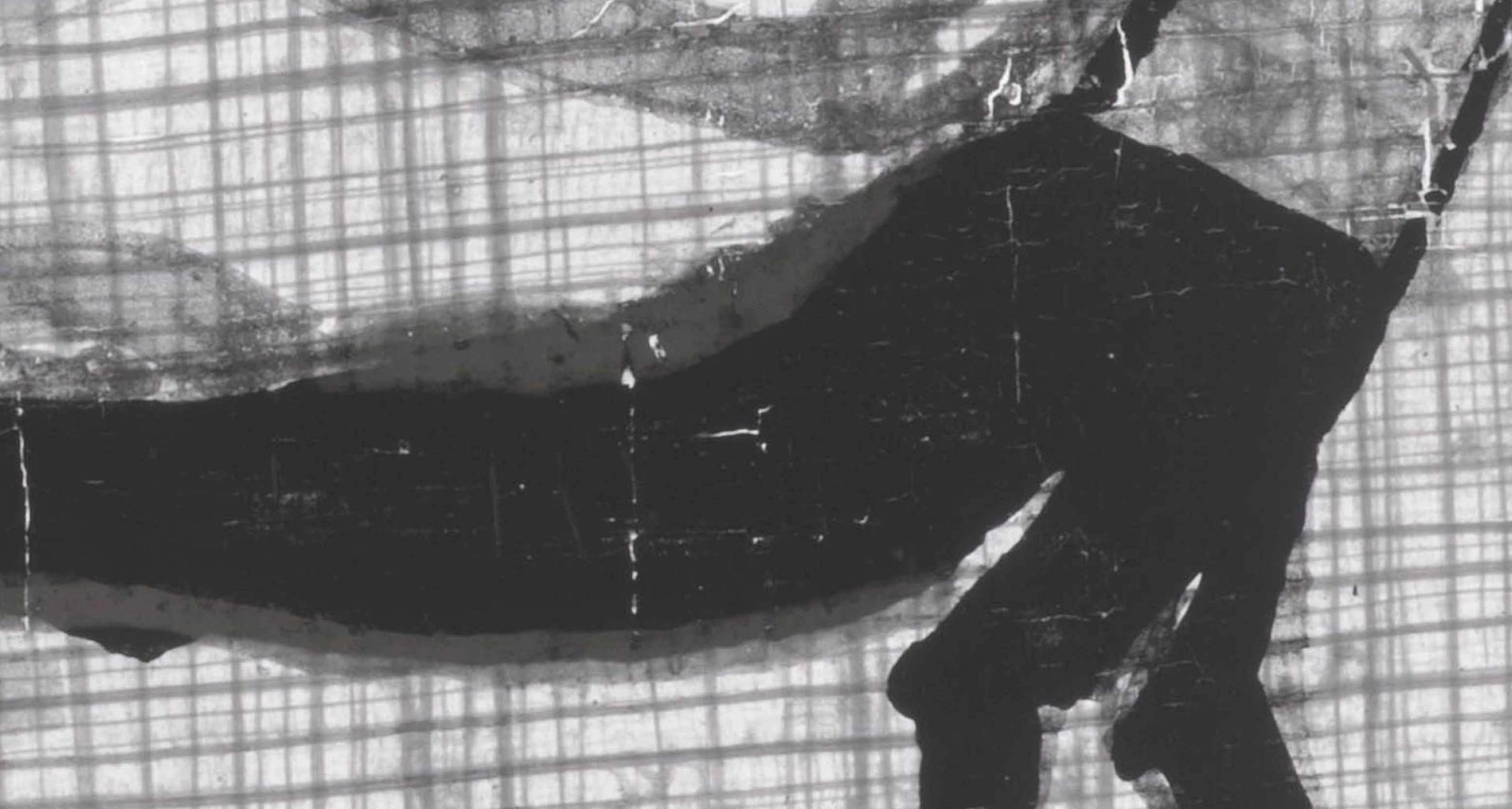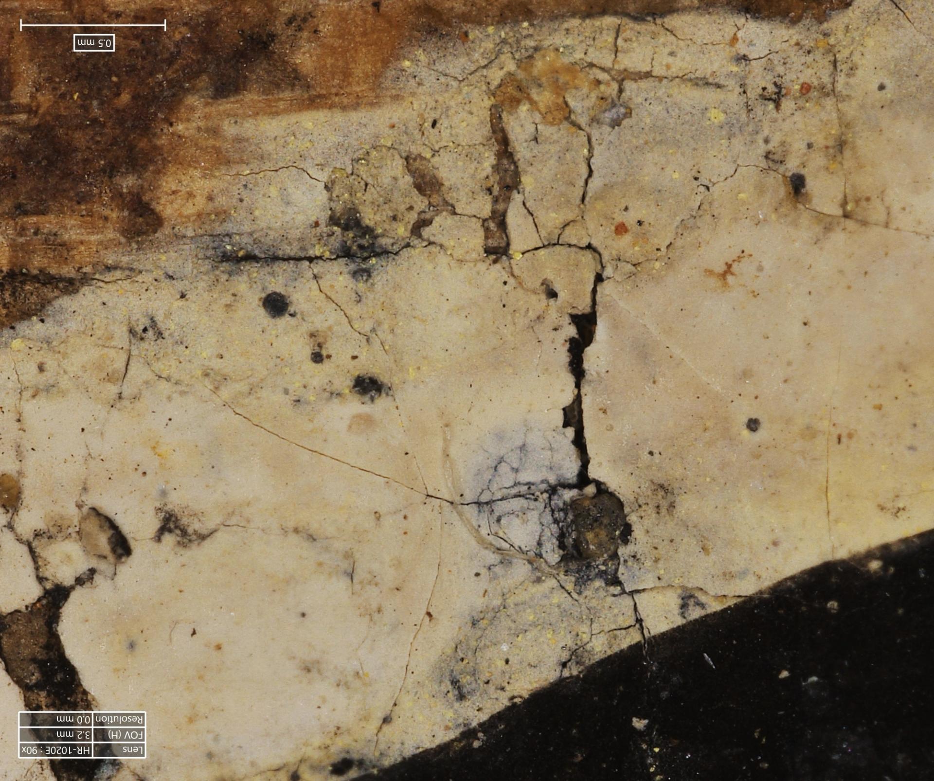 A detail of the back of the jackal magnified 90 times, made using a 3D digital microscope, shows how the white paint overlies the black of the animal’s body. Flecks of yellow orpiment can be seen where the white paint is slightly thinner