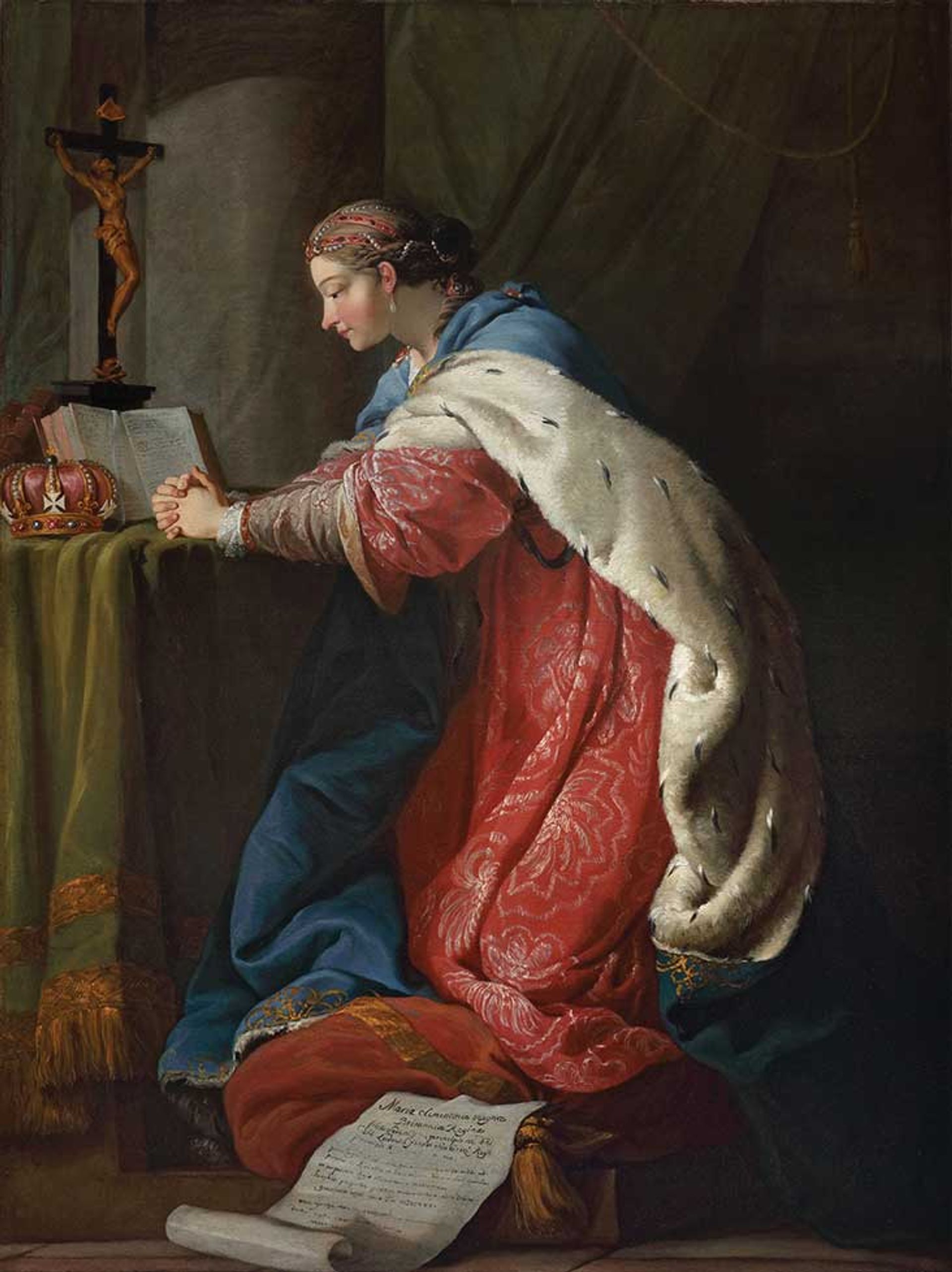 This work, painted towards the end of Sobieska's short life, shows the noblewoman praying with a crown laid on the altar, a symbol of her giving up her royal status to devote herself to her faith. Beside her is a letter in Latin that names her and denotes the painting as a grateful monument to her “royal munificence”, indicating that it was made for a library to which she donated works.