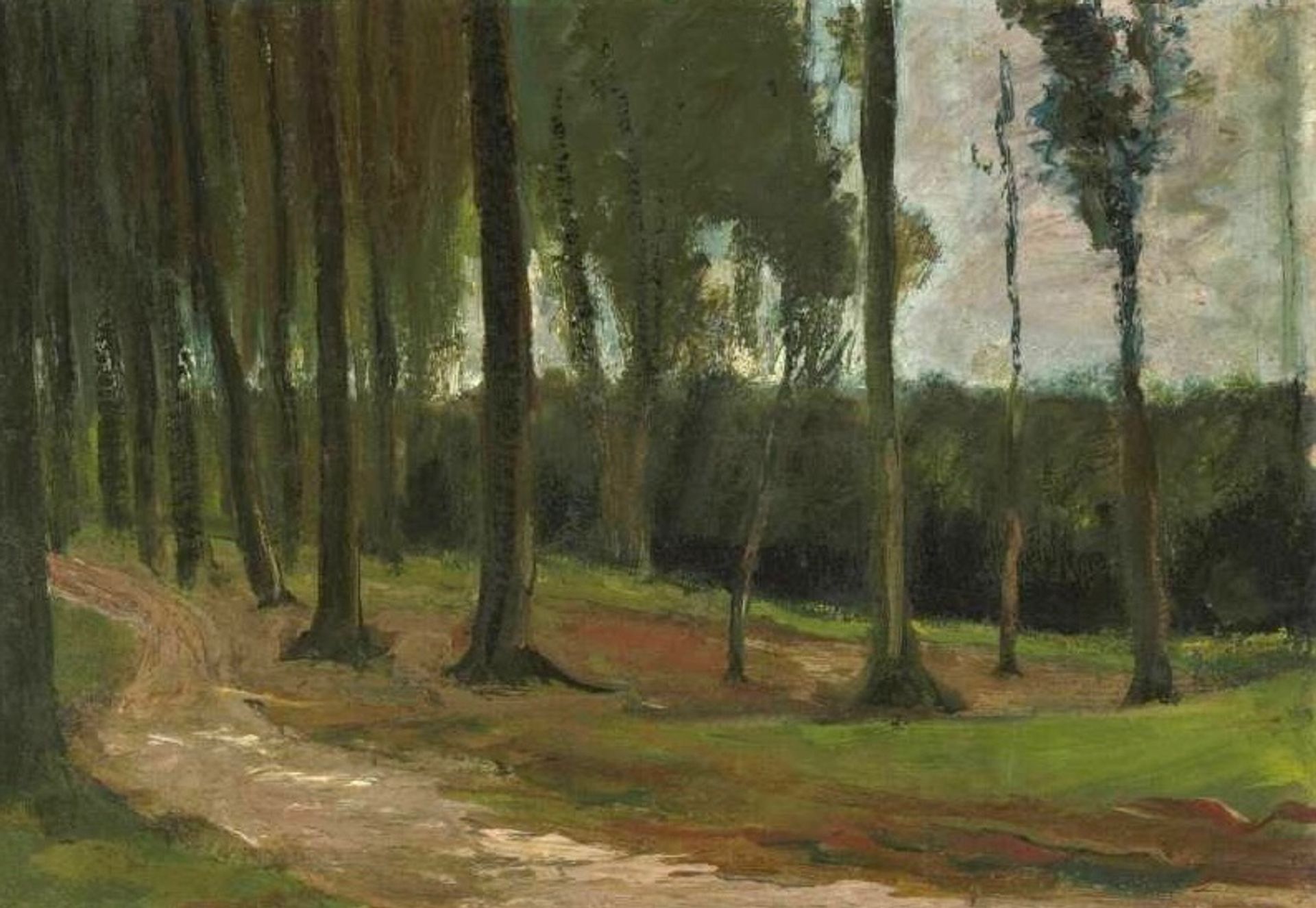 The Christie’s painting is on canvas, whereas a year before, in 1882, he had been using oil paint on paper. An examination of the Christie’s work reveals that it was painted on the same roll of canvas as a third composition, Edge of a Wood (August-September 1883).
