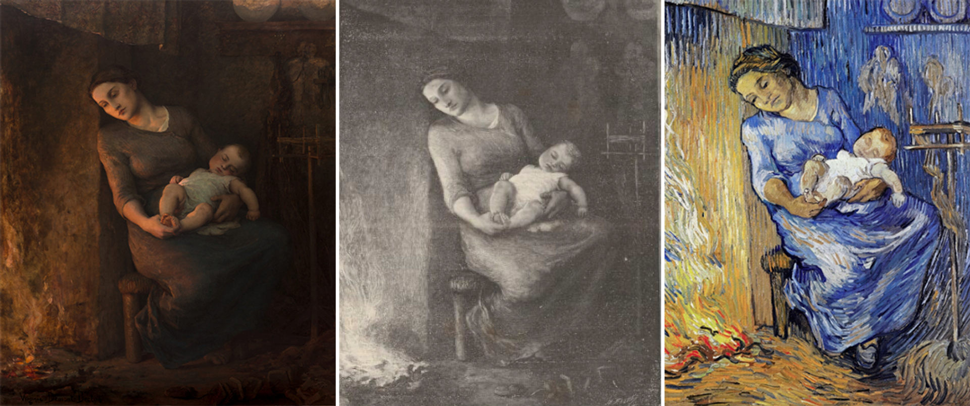 The Van Gogh Museum has just bought Virginie Demont-Breton’s painting The Man is at Sea (1889), a work which inspired Van Gogh. It depicts a mother, holding her baby, who sits by the fireplace, worrying about the dangers faced by her fisher husband.