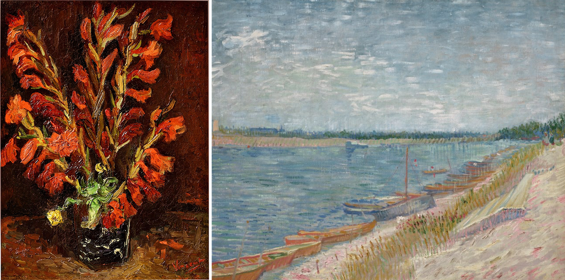 Van Gogh’s Still life: Vase with Gladioli (August-September 1886) and Moored Boats (July 1887), which were auctioned in Hong Kong in 2021 and 2024