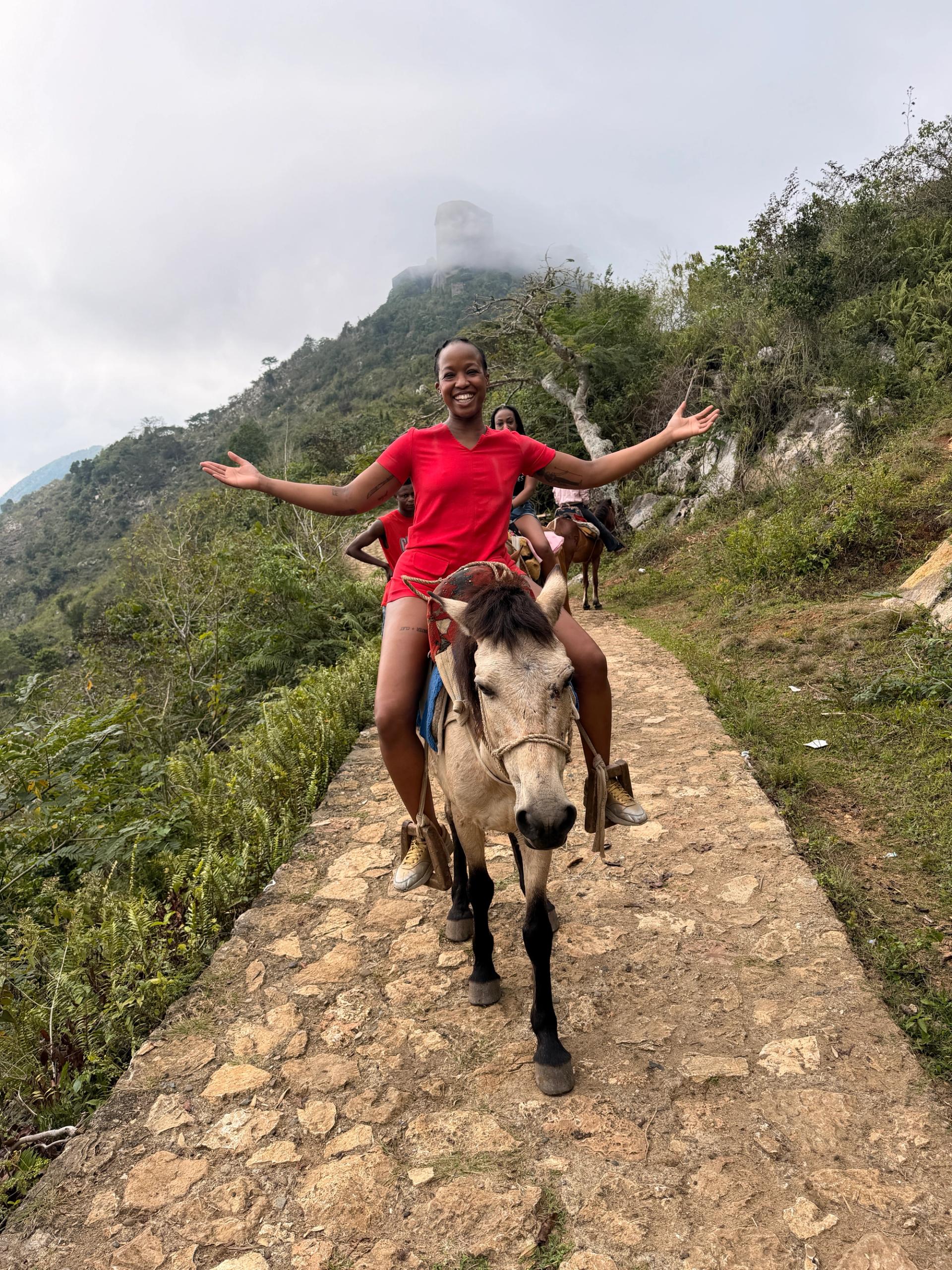 The author riding her donkey on the path leading to Citadelle Laferrière Courtesy Ruth Jean-Marie