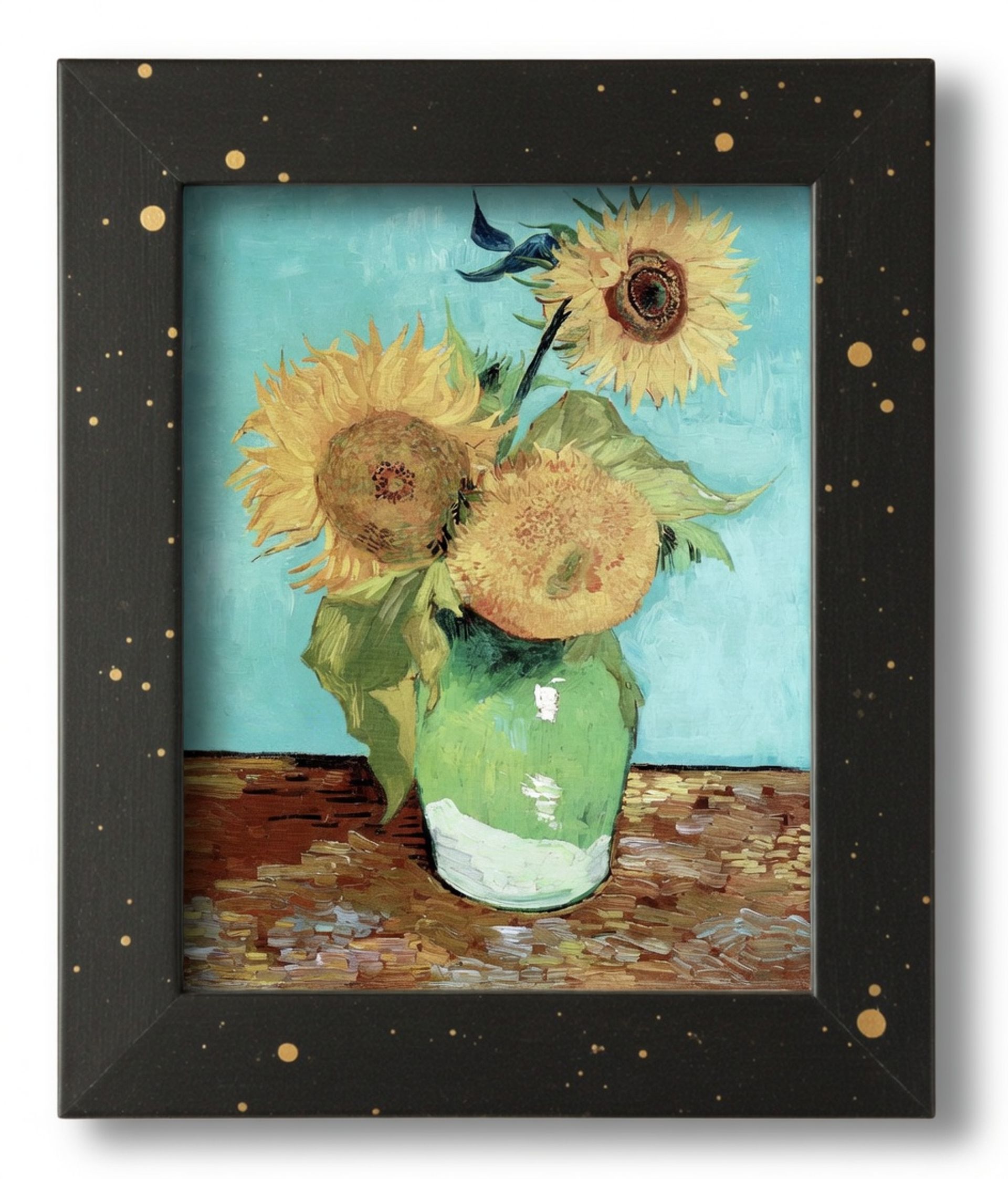 The Three Sunflowers frame was covered with a very dark lacquer and decorated with randomly placed gold circles. What is most unusual is that the outer edges were not straight, but they were partly set back at a slight angle. This would be a curious design for a frame for any painting, but it is even more astonishing for a Van Gogh masterpiece.